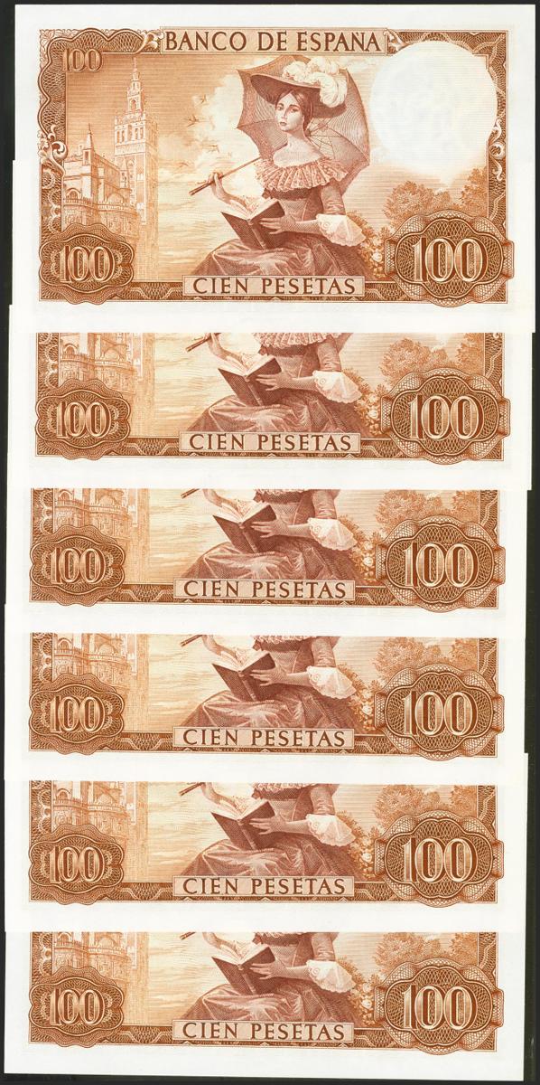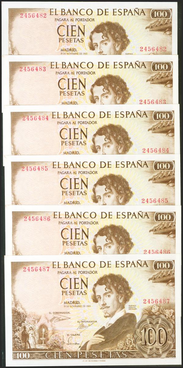 Conjunto de 6 billetes de 100 Pesetas, emitidos el 19 de Noviembre de 1965, sin serie. (Edifil 2021: 470), conservando todo su apresto original. SC.