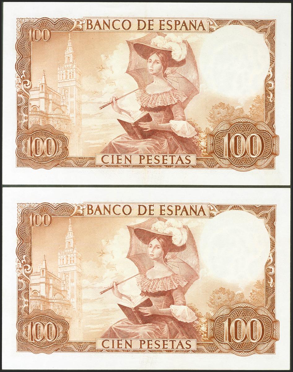 100 Pesetas. 19 de Noviembre de 1965. Pareja correlativa. Serie T. (Edifil 2021: 470a). Apresto original. SC/EBC+.