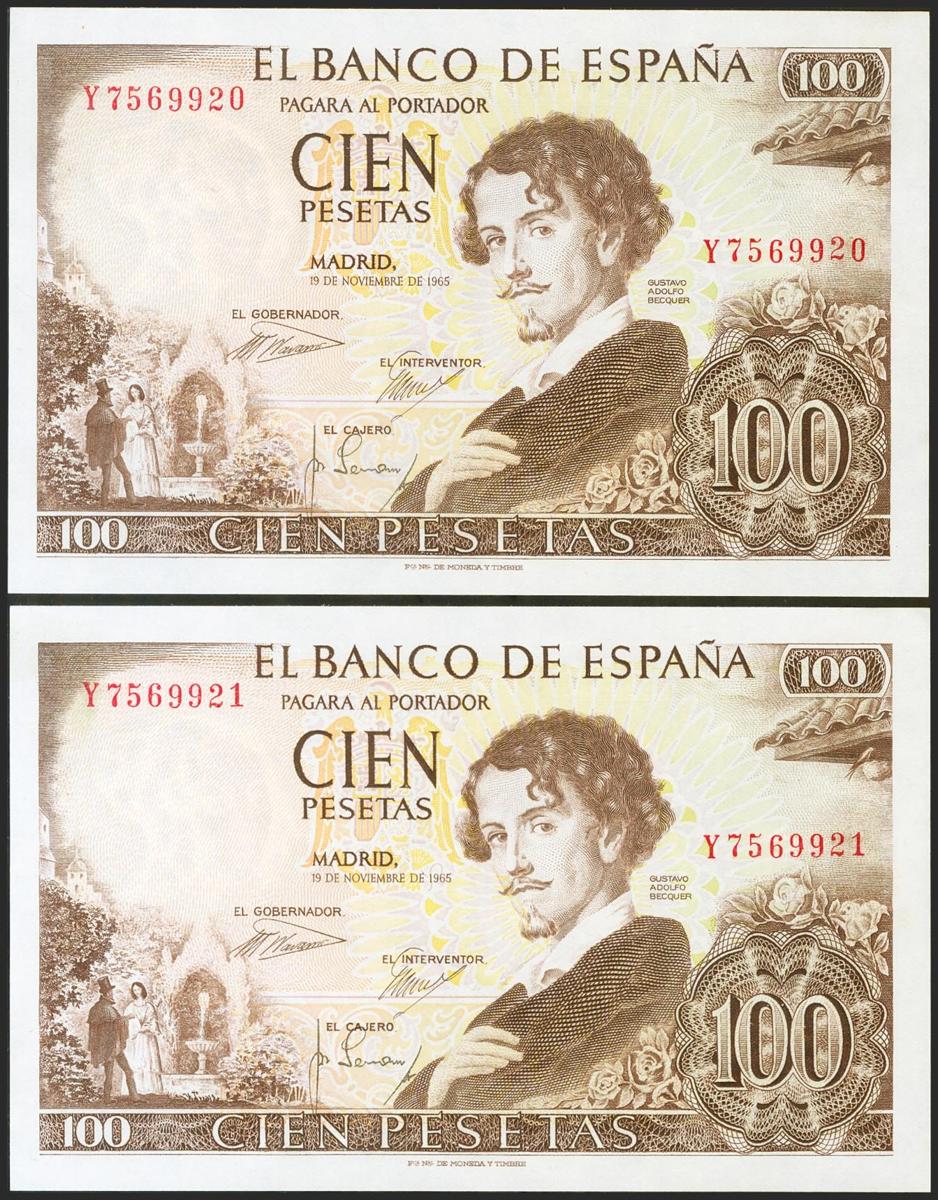 100 Pesetas. 19 de Noviembre de 1965. Pareja correlativa. Serie Y. (Edifil 2021: 470a). Apresto original. SC.