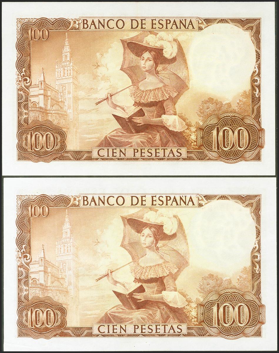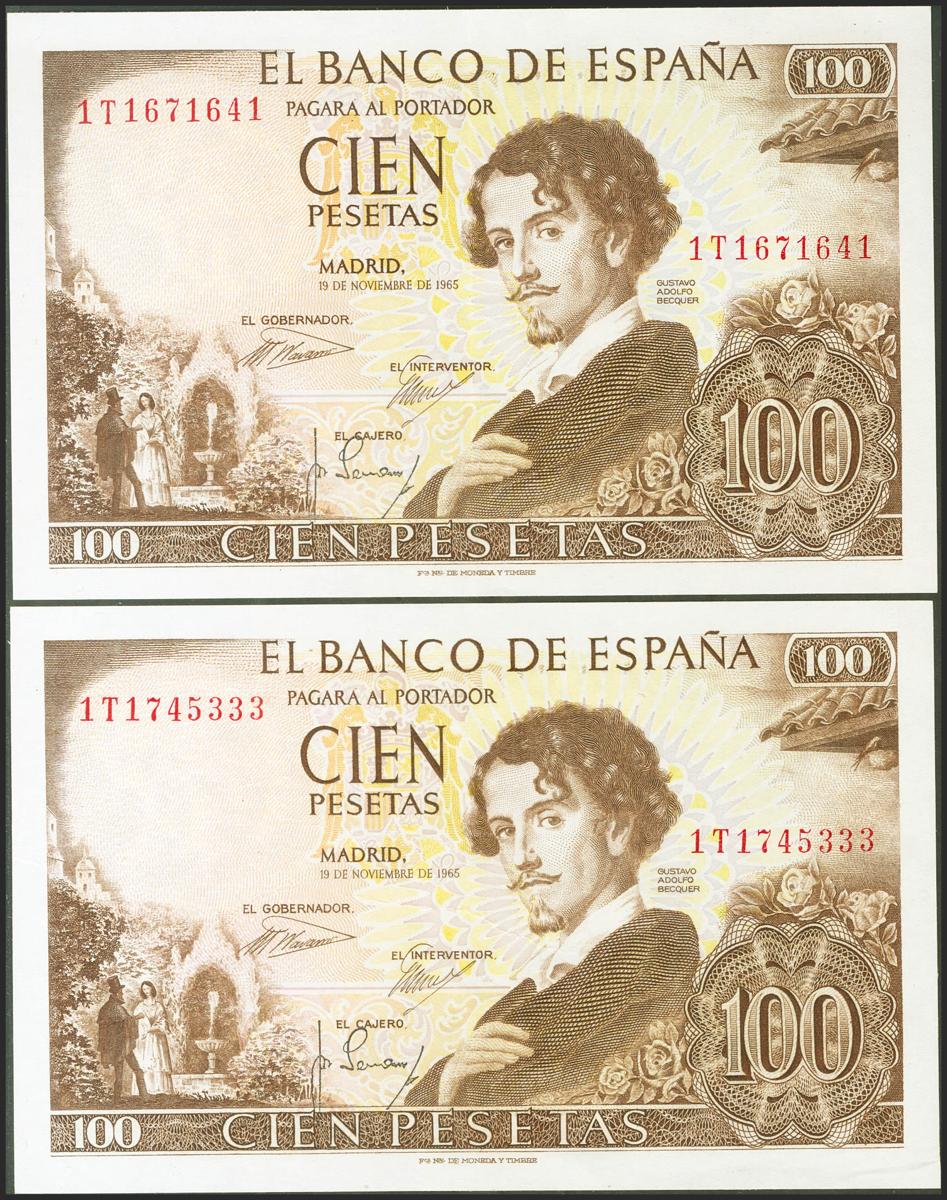 Conjunto de 2 billetes de 100 Pesetas emitidos el 19 de Noviembre de 1965 con la serie 1T, última serie emitida (Edifil 2021: 470a), apresto original. EBC/SC.