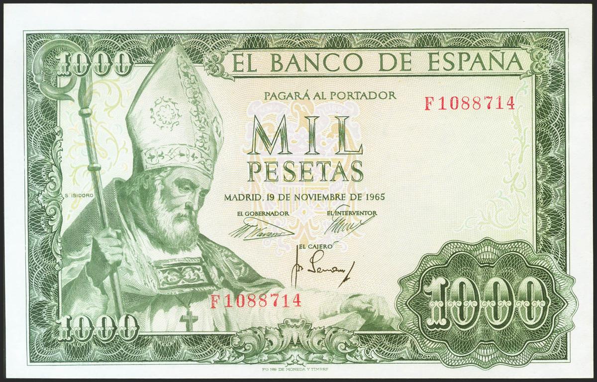 1000 Pesetas. 19 de Noviembre de 1965. Serie F. (Edifil 2021: 471b). Conserva todo el apresto original. EBC+.