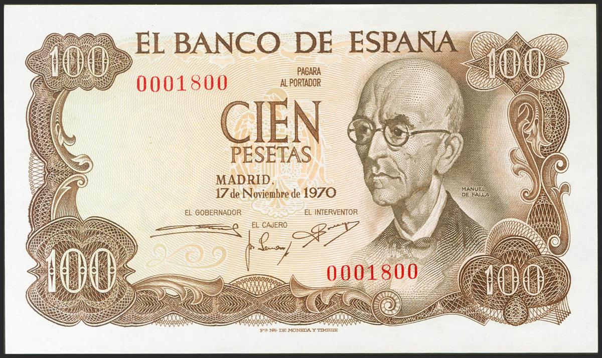 100 Pesetas. 17 de Noviembre de 1970. Sin serie y preciosa bajísima numeración. (Edifil 2021: 472). Apresto original. SC.