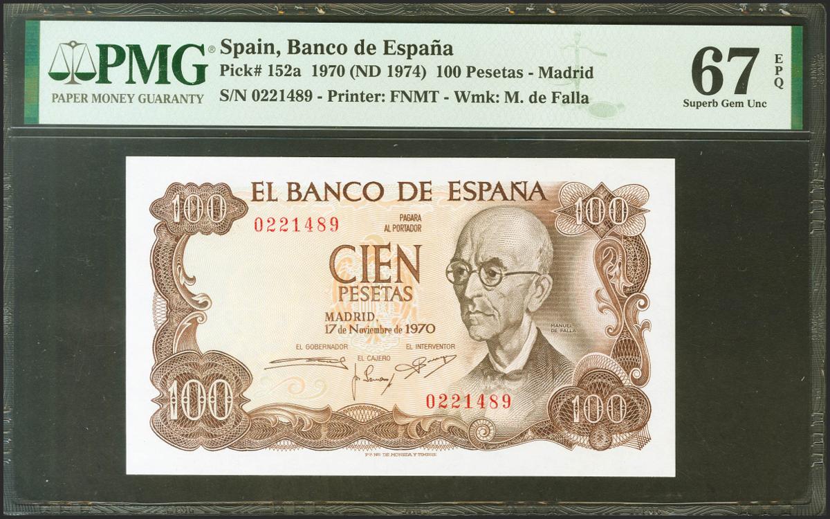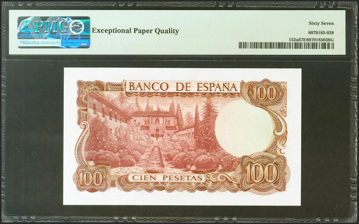 100 Pesetas. 17 de Noviembre de 1970. Sin serie. (Edifil 2021: 472, Pick: 152a). Apresto original. Encapsulado PMG67EPQ.