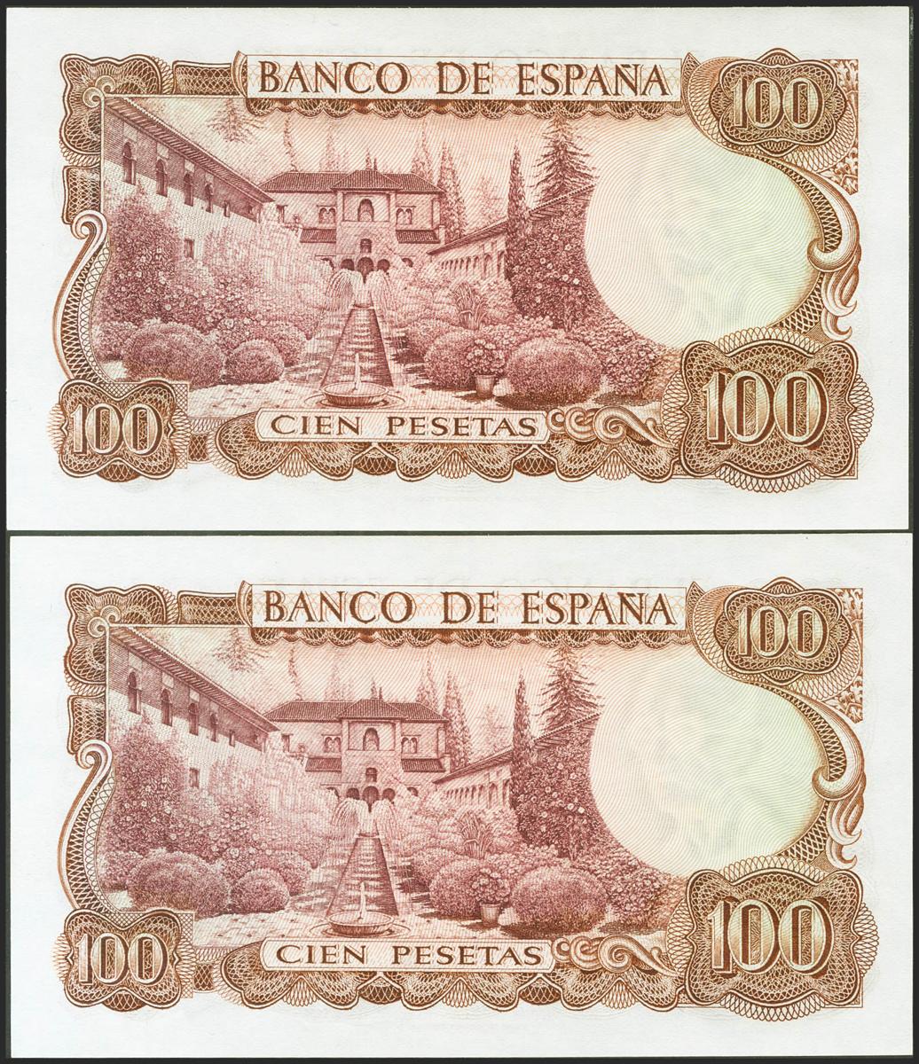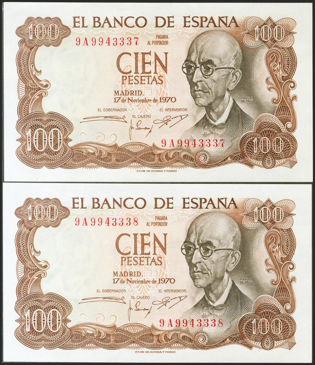 100 Pesetas. 17 de Noviembre de 1970. Pareja correlativa. Serie especial 9A. (Edifil 2021: 472d). Conserva todo su apresto original. SC.