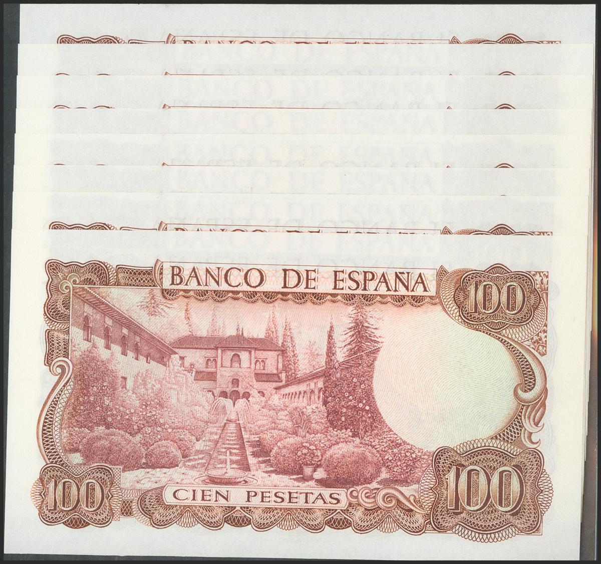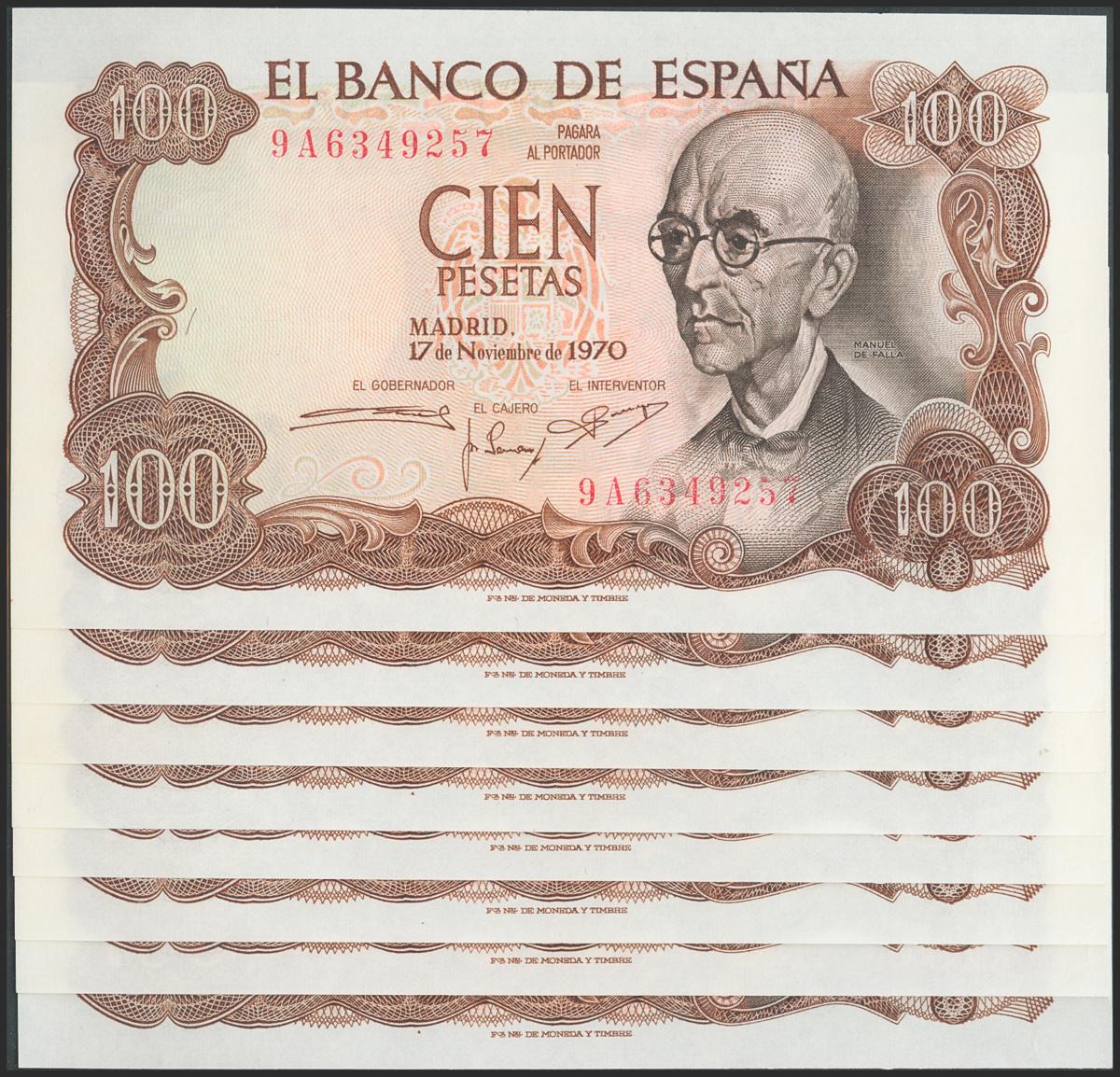 Conjunto de 8 billetes correlativos de 100 pesetas emitidos el 17 de Noviembre de 1970 de la serie 9A (Edifil 2017: 472d), con el apresto original. SC.