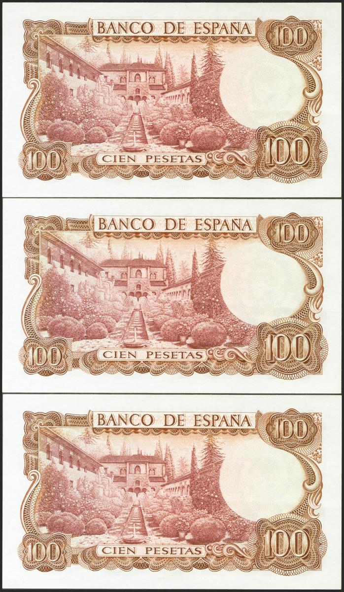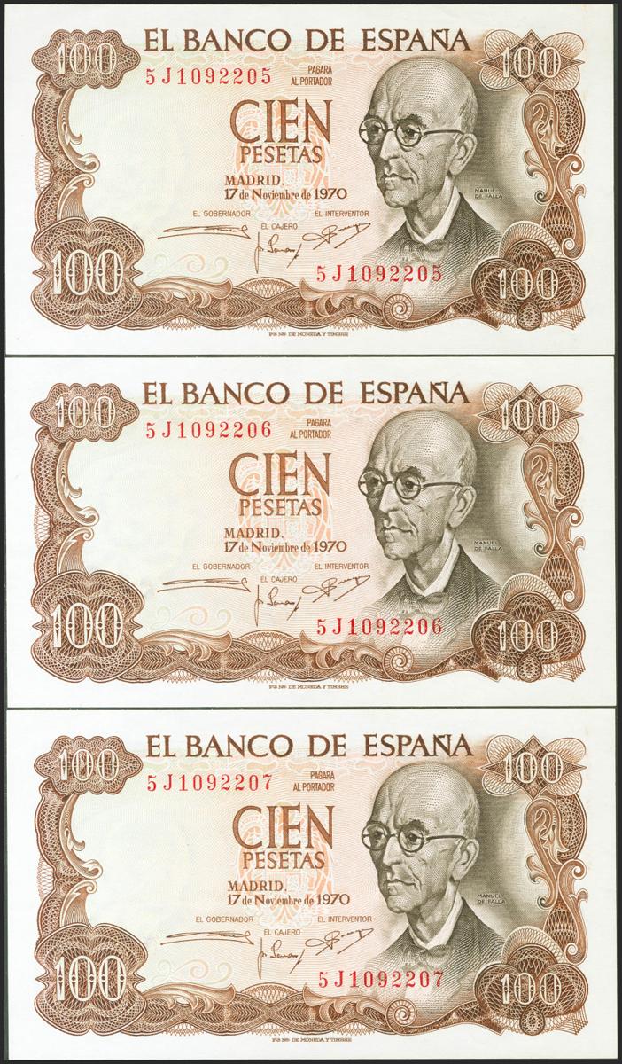 100 Pesetas. 17 de Noviembre de 1970. Trío correlativo. Serie 5J. (Edifil 2021: 472c). Apresto original. EBC++.