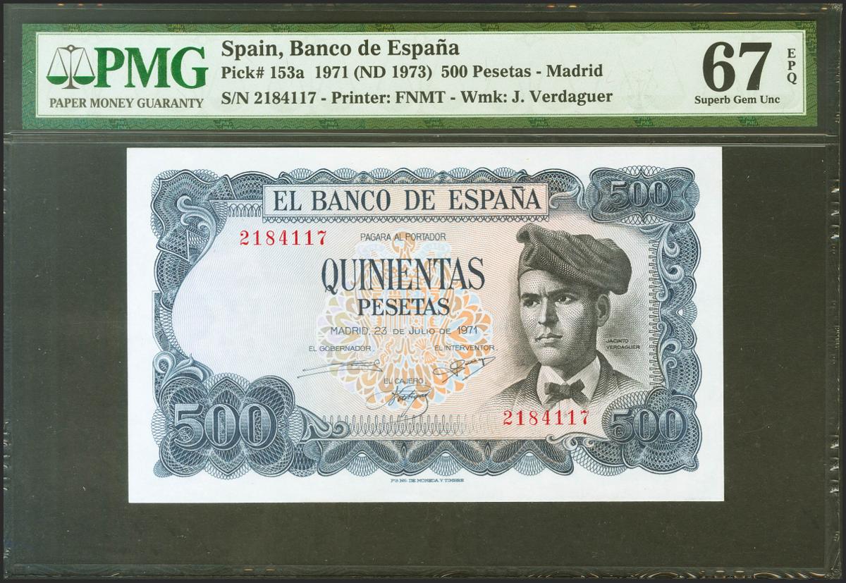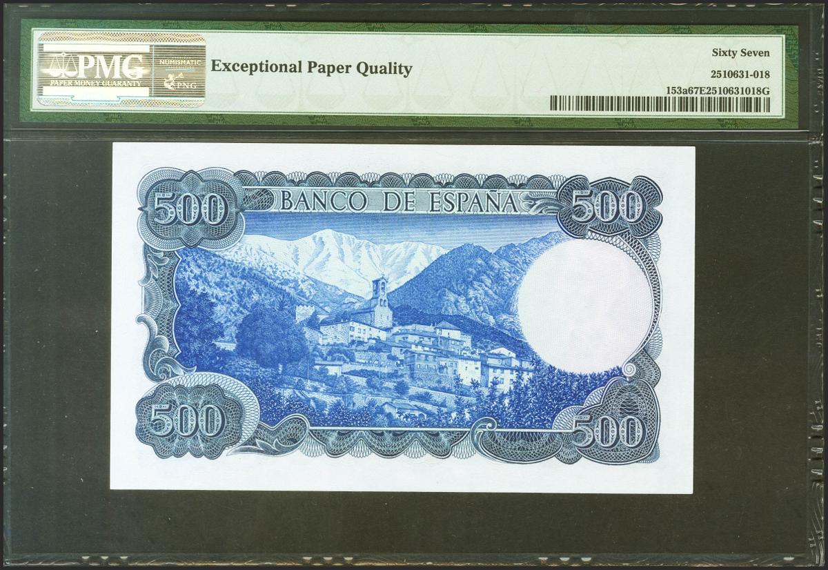 500 Pesetas. 23 de Julio de 1971. Sin serie. (Edifil 2021: 473, Pick: 153a). Apresto original. Encapsulado PMG67EPQ.