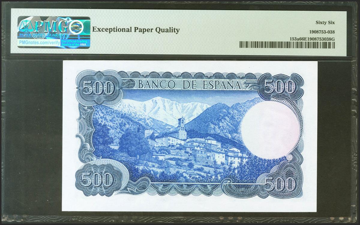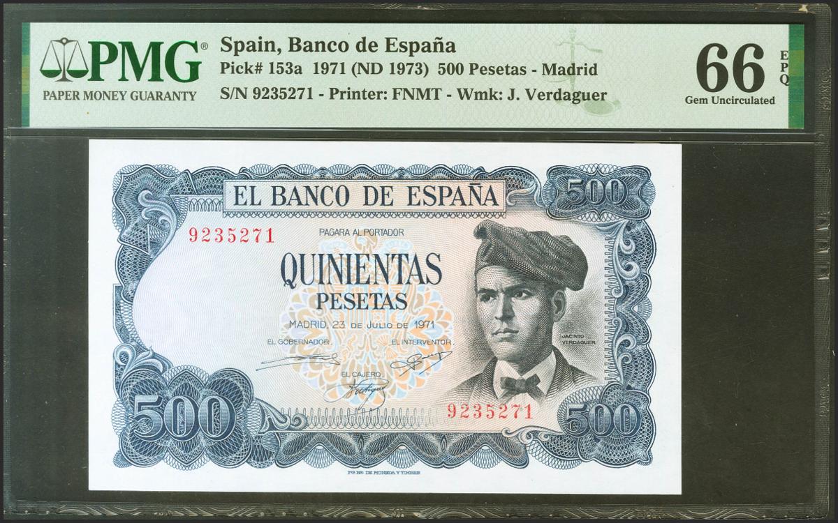 500 Pesetas. 23 de Julio de 1971. Sin serie. (Edifil 2021: 473, Pick: 153). Rarísimo en esta calidad, apresto original. SC. Encapsulado PMG66EPQ.