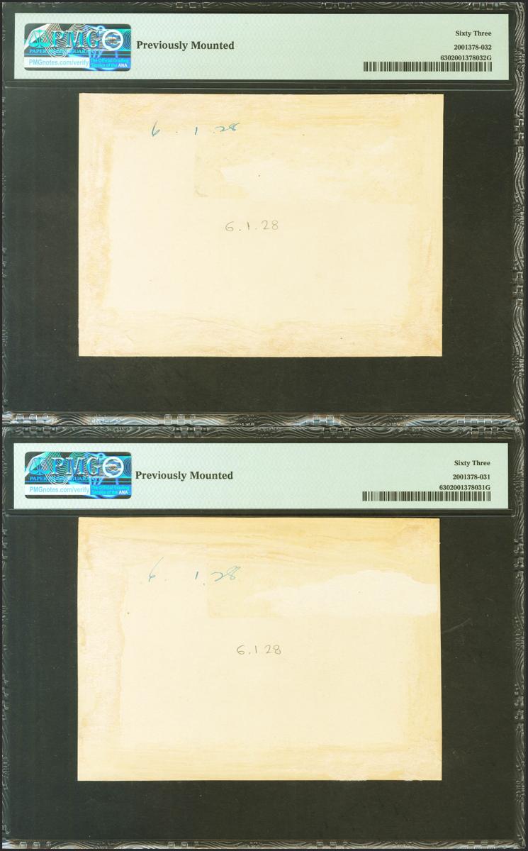 Conjunto de 2 pruebas fotográficas del anverso y reverso de un billete no adoptado similar al de 100 Pesetas de la emisión del 15 de Julio de 1928 (con fecha en el billete de 1 de Julio de 1928), con la serie A y numeración 000000. Muy interesante conjunto. SC. Encapsulados PMG63, ambos.