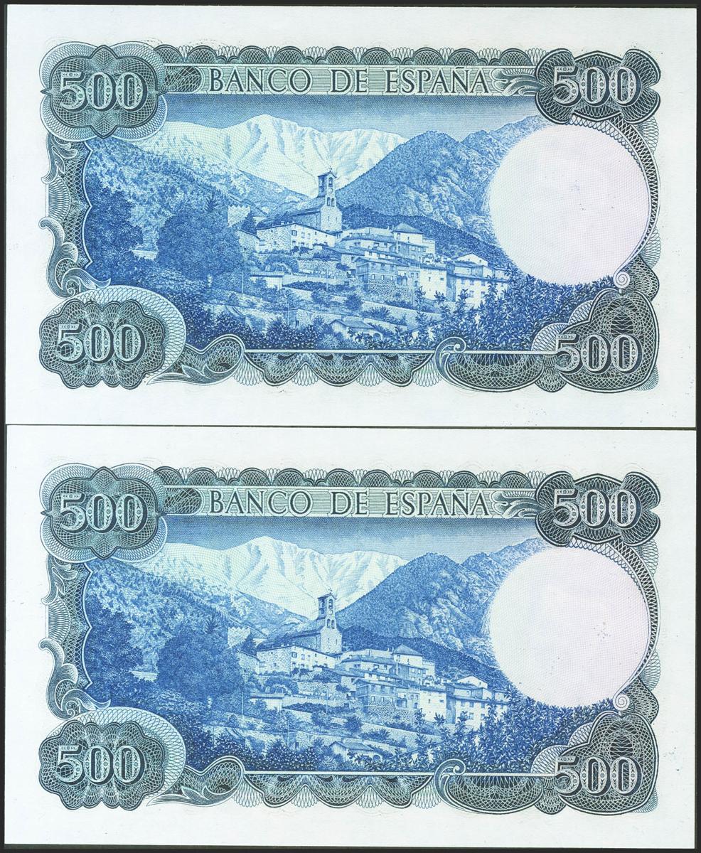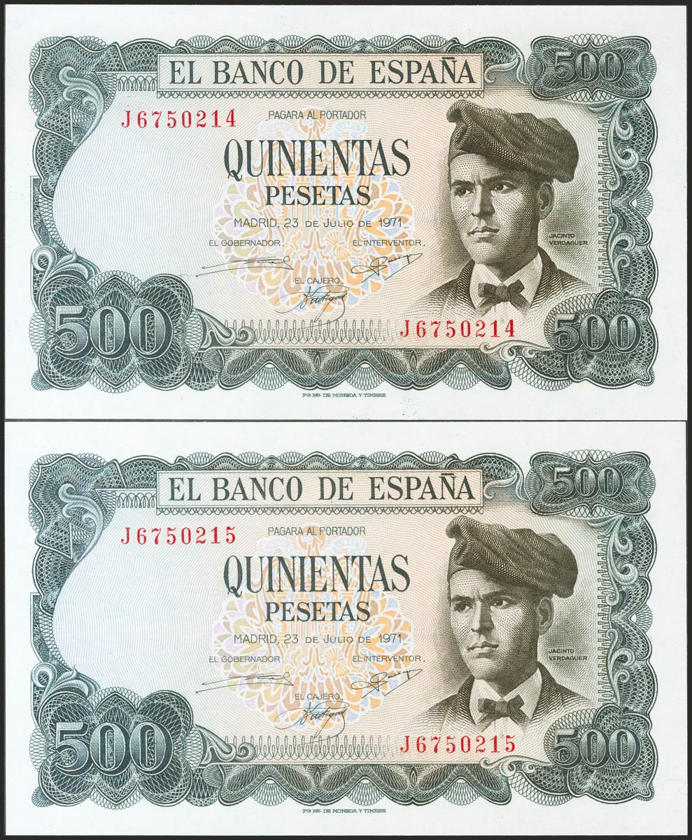 500 Pesetas. 23 de Julio de 1971. Pareja correlativa. Serie J. (Edifil 2021: 473a). Apresto original. SC.