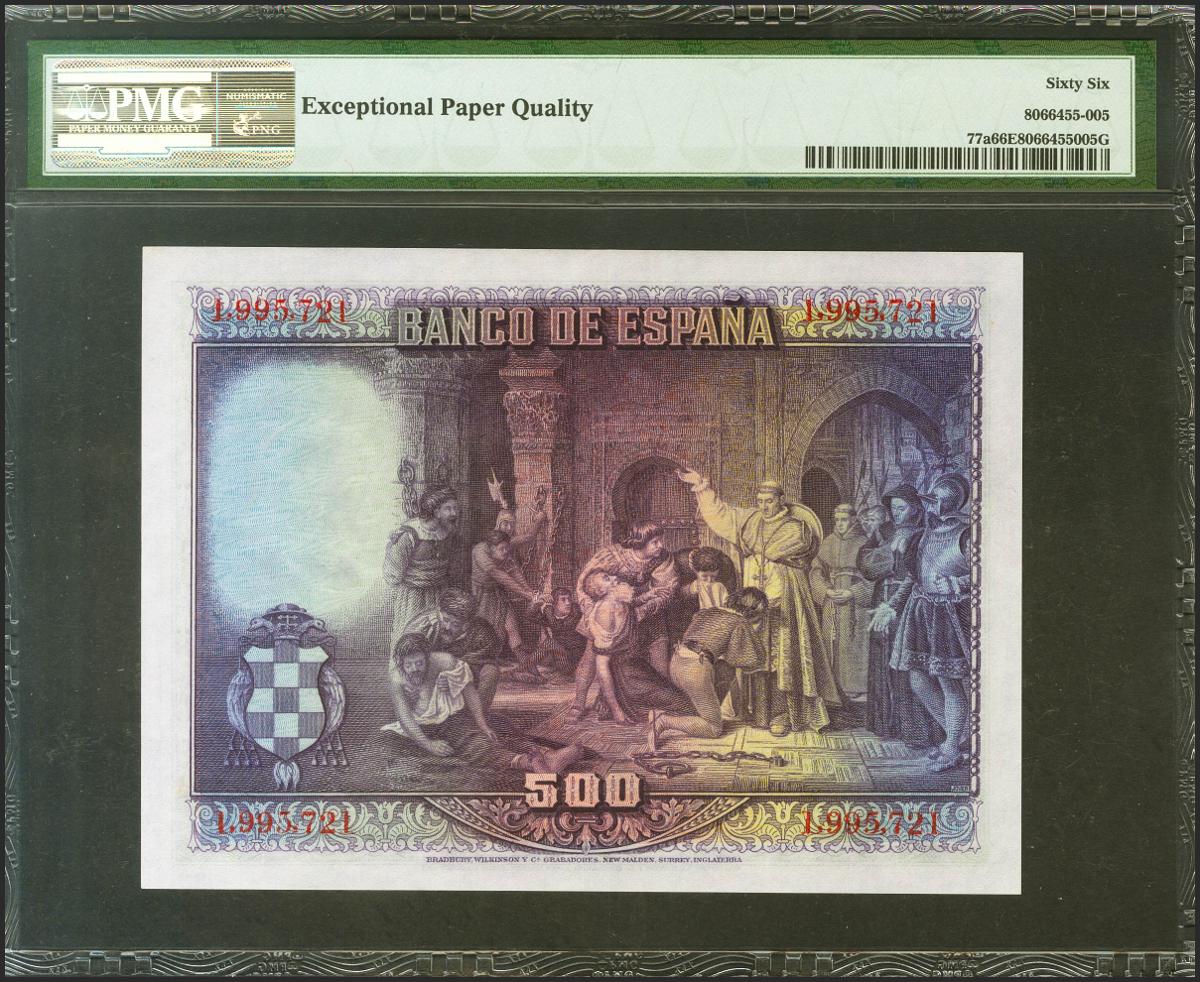 500 Pesetas. 15 de Agosto de 1928. Sin serie. (Edifil 2021: 356, Pick: 77a). Apresto original. Encapsulado PMG66EPQ.