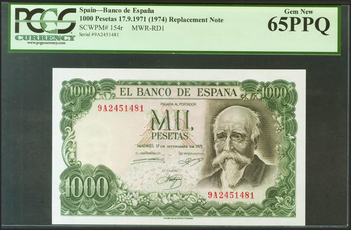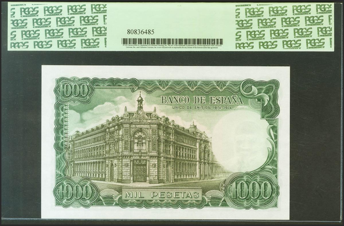 1000 Pesetas. 17 de Septiembre de 1971. Serie especial 9A. (Edifil 2021: 474d). Muy raro en esta calidad, apresto original. SC. Encapsulado PCGS65PPQ.