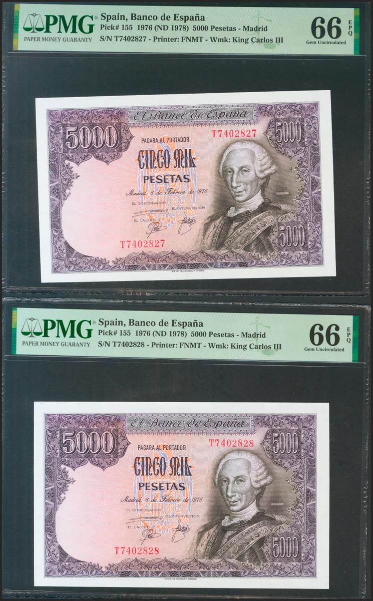 5000 Pesetas. 6 de Febrero de 1976. Pareja correlativa. Serie T. (Edifil 2021: 475a, Pick: 155). Rarísima en esta calidad, apresto original. SC. Encapsulado PMG66EPQ, ambos.