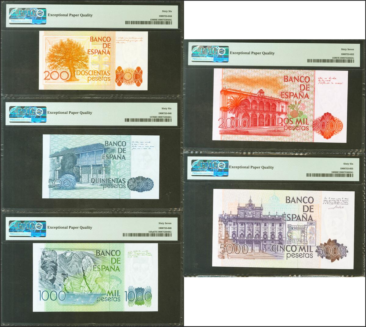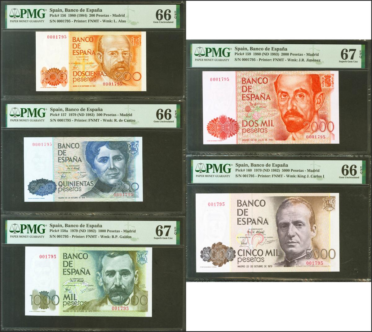 Conjunto de 5 billetes del Banco de España de 200 Pesetas, 500 Pesetas, 1000 Pesetas, 2000 Pesetas y 5000 Pesetas, todos los billetes emitidos entre 1979 y 1985 a excepción del 10000 Pesetas, todos sin serie y con la misma numeración baja 0001795. (Edifil 2017: 480, 476, 477, 478, 479). Apresto original. SC. Encapsulados PMG66EPQ 200 Pesetas, PMG66EPQ 500 Pesetas, PMG67EPQ 1000 Pesetas, PMG67EPQ 2000 Pesetas, PMG66EPQ 5000 Pesetas.
