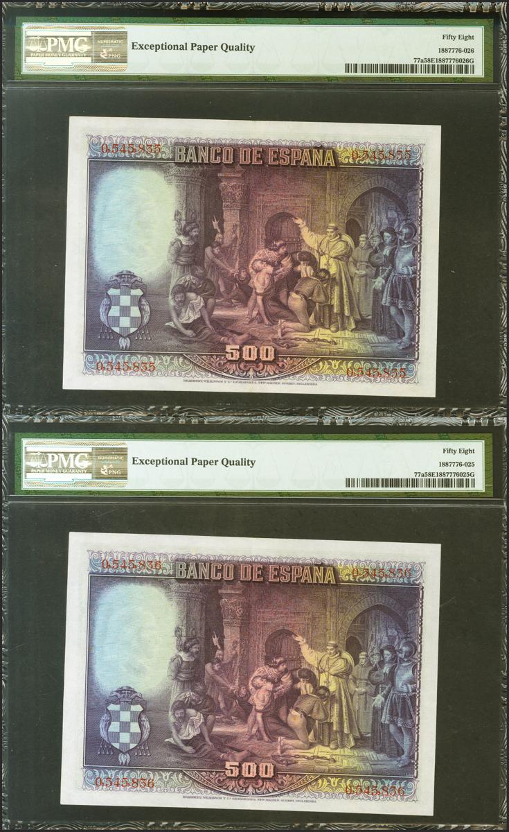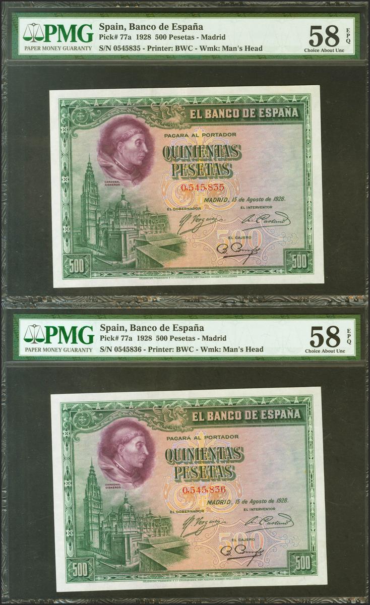 500 Pesetas. 15 de Agosto de 1928. Pareja correlativa. Sin serie. (Edifil 2021: 356, Pick: 77a). Apresto original. EBC+++. Encapsulados PMG58EPQ, ambos.