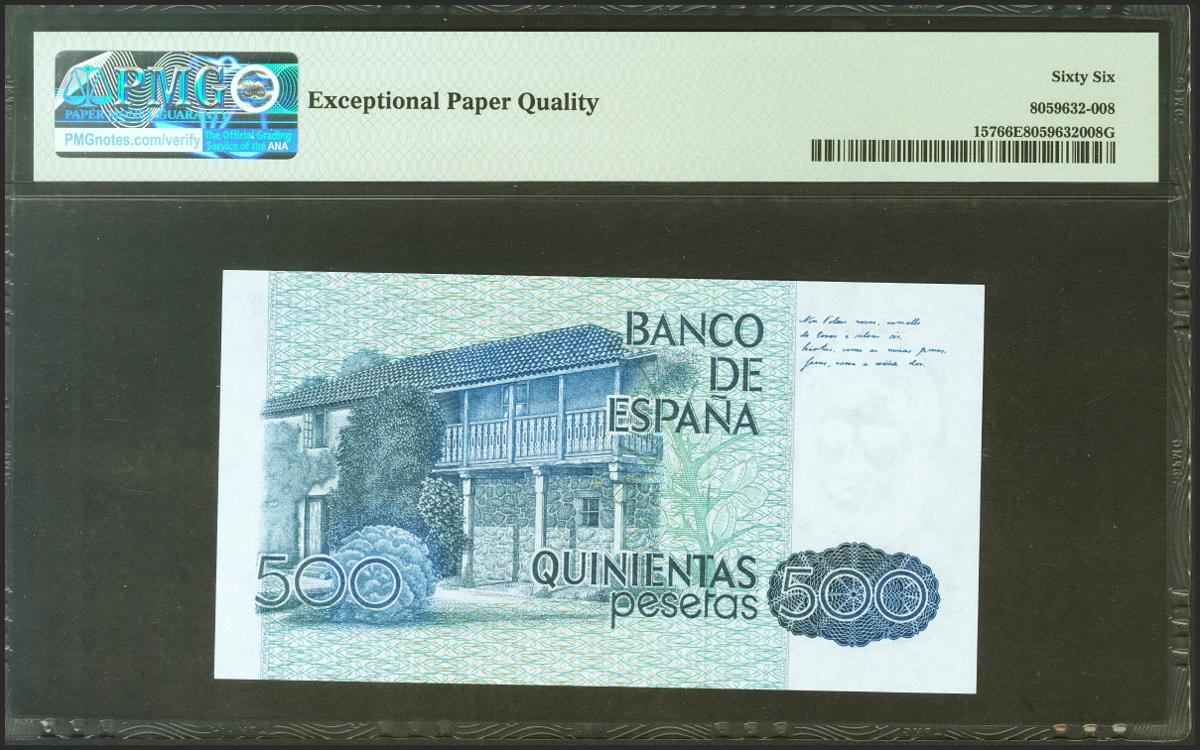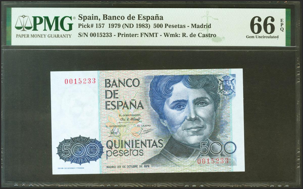 500 Pesetas. 23 de Octubre de 1979. Sin serie. (Edifil 2021: 476, Pick: 157). Apresto original. SC. Encapsulado PMG66EPQ.