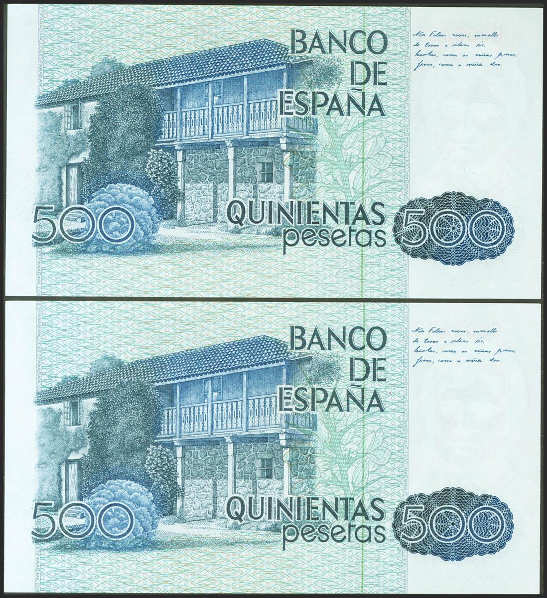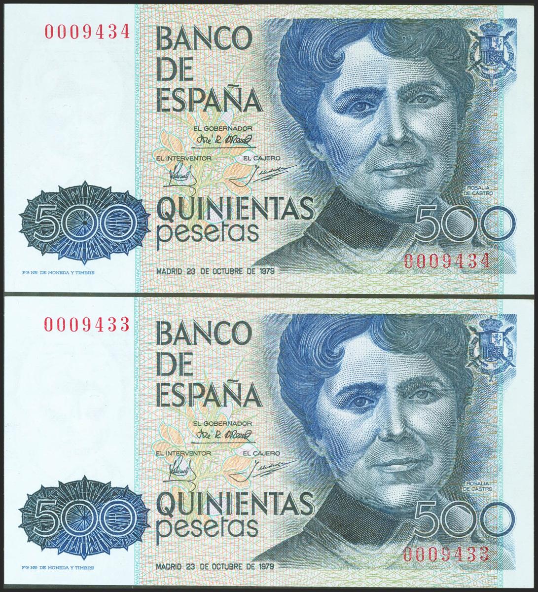 500 Pesetas. 23 de Octubre de 1979. Pareja correlativa. Sin serie y numeración muy baja. (Edifil 2021: 476). SC.