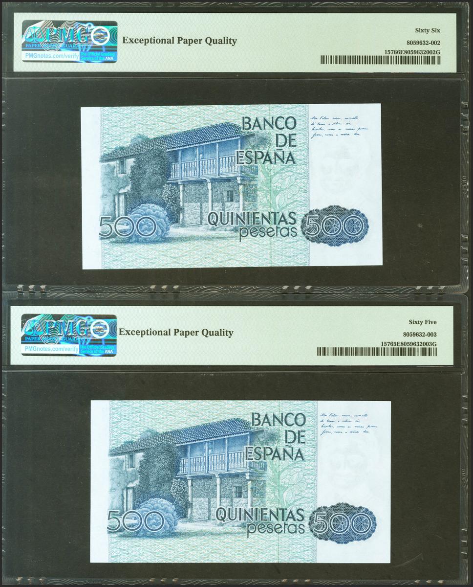 500 Pesetas. 23 de Octubre de 1979. Pareja correlativa. Sin serie y numeración baja. (Edifil 2021: 476, Pick: 157). Apresto original. SC. Encapsulados PMG66EPQ/65EPQ.