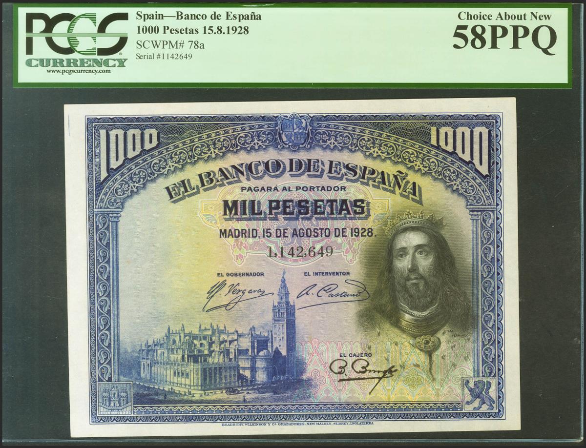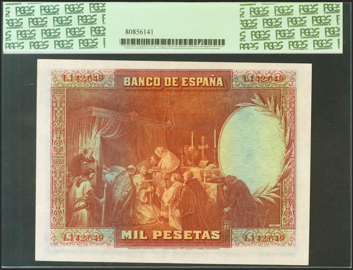 1000 Pesetas. 15 de Agosto de 1928. Sin serie. (Edifil 2021: 357). Apresto original. EBC++. Encapsulado PCGS58PPQ.
