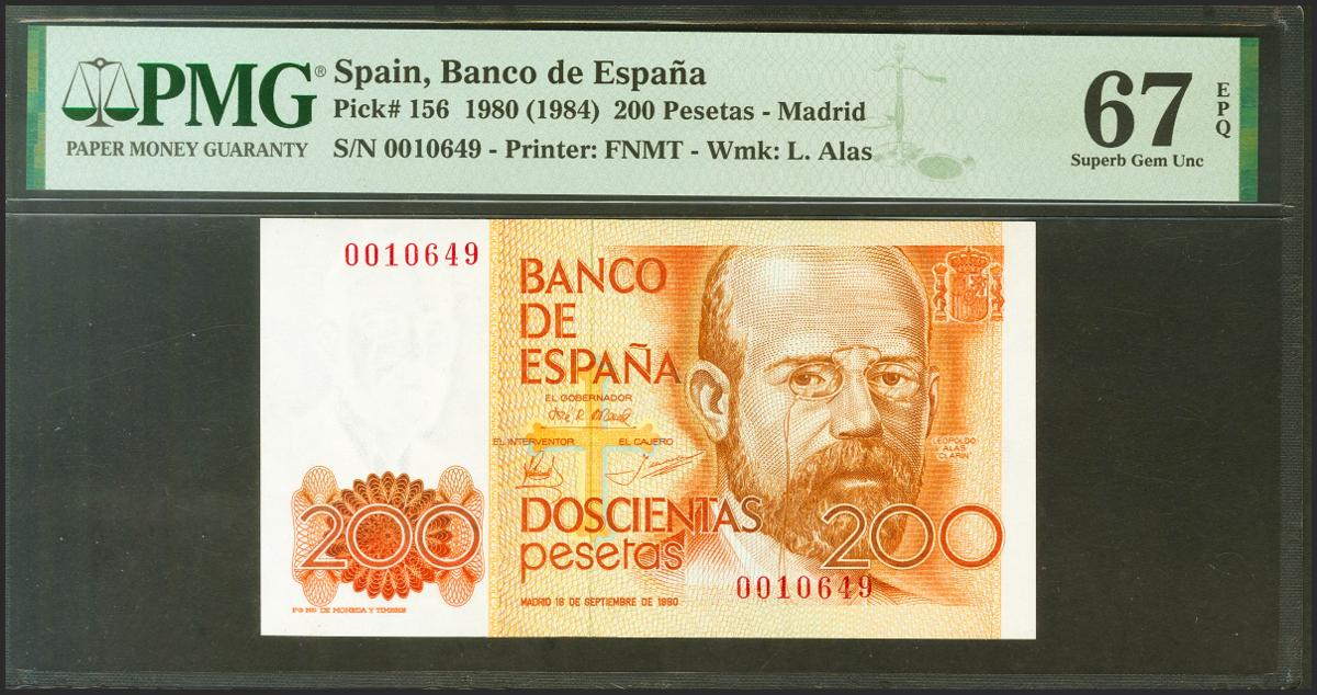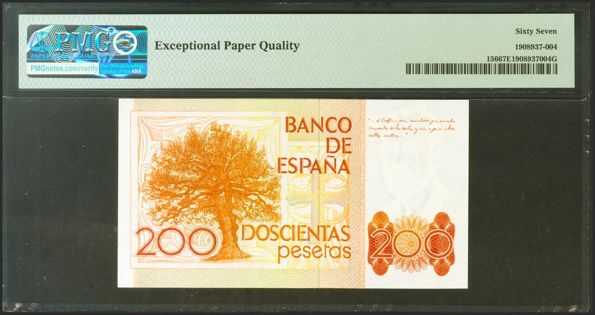 200 Pesetas. 16 de Septiembre de 1980. Sin serie y numeración baja. (Edifil 2021: 480, Pick: 156). Apresto original. Encapsulado PMG67EPQ.