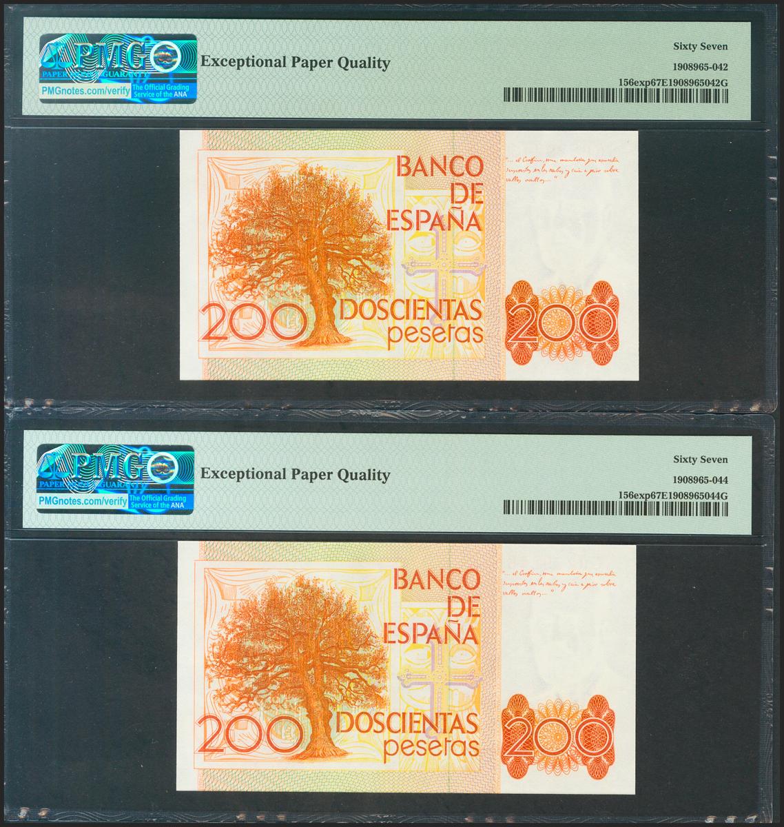 200 Pesetas. 16 de Septiembre de 1980. Pareja correlativa. Serie especial 8C. (Edifil 2021: 480c, Pick: 156exp). Rarísima en esta excepcional calidad, apresto original. SC. Encapsulado PMG67EPQ, ambos.