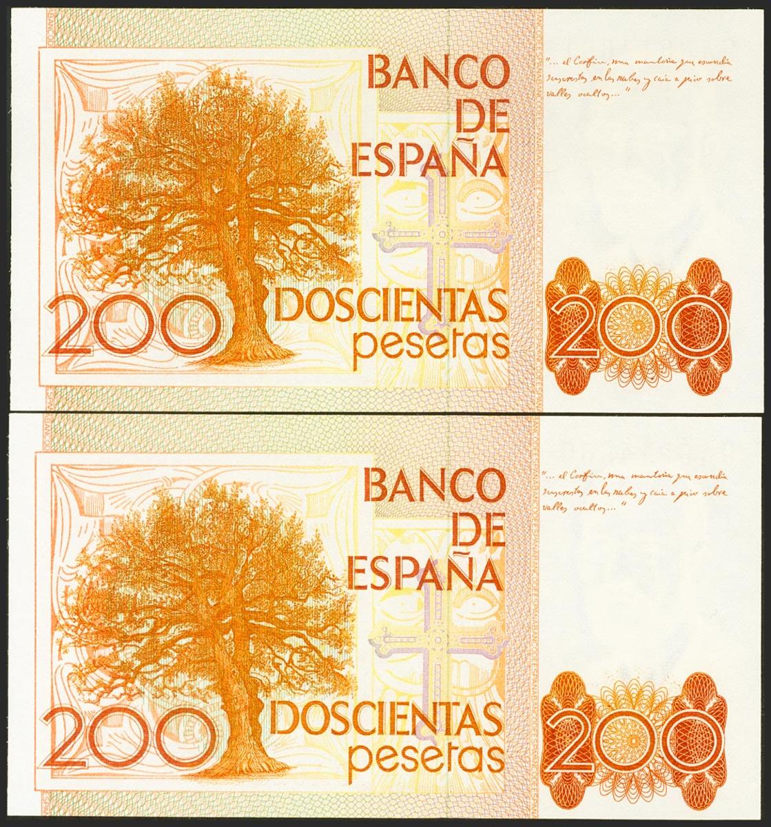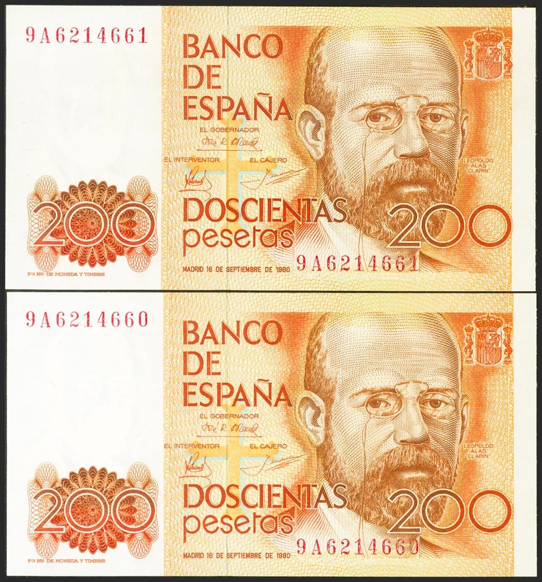 200 Pesetas. 16 de Septiembre de 1980. Pareja correlativa. Serie especial 9A. (Edifil 2021: 480b). SC.