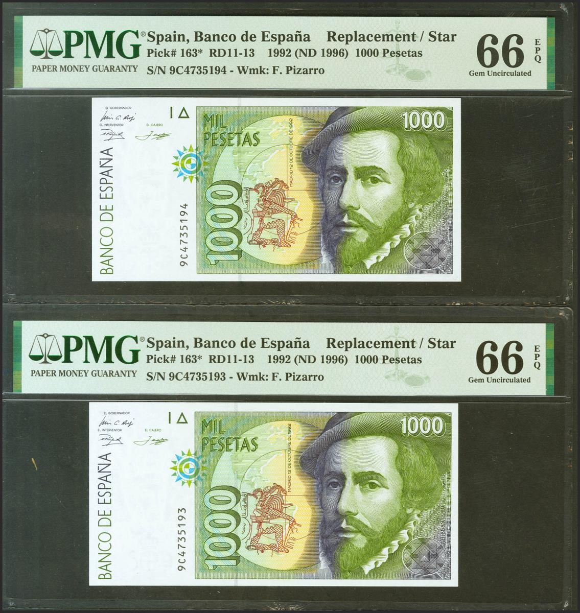 1000 Pesetas. 12 de Octubre de 1992. Pareja correlativa. Serie especial 9C. (Edifil 2021: 483d, Pick: 163*). Apresto original. SC. Encapsulados PMG66EPQ, ambos.