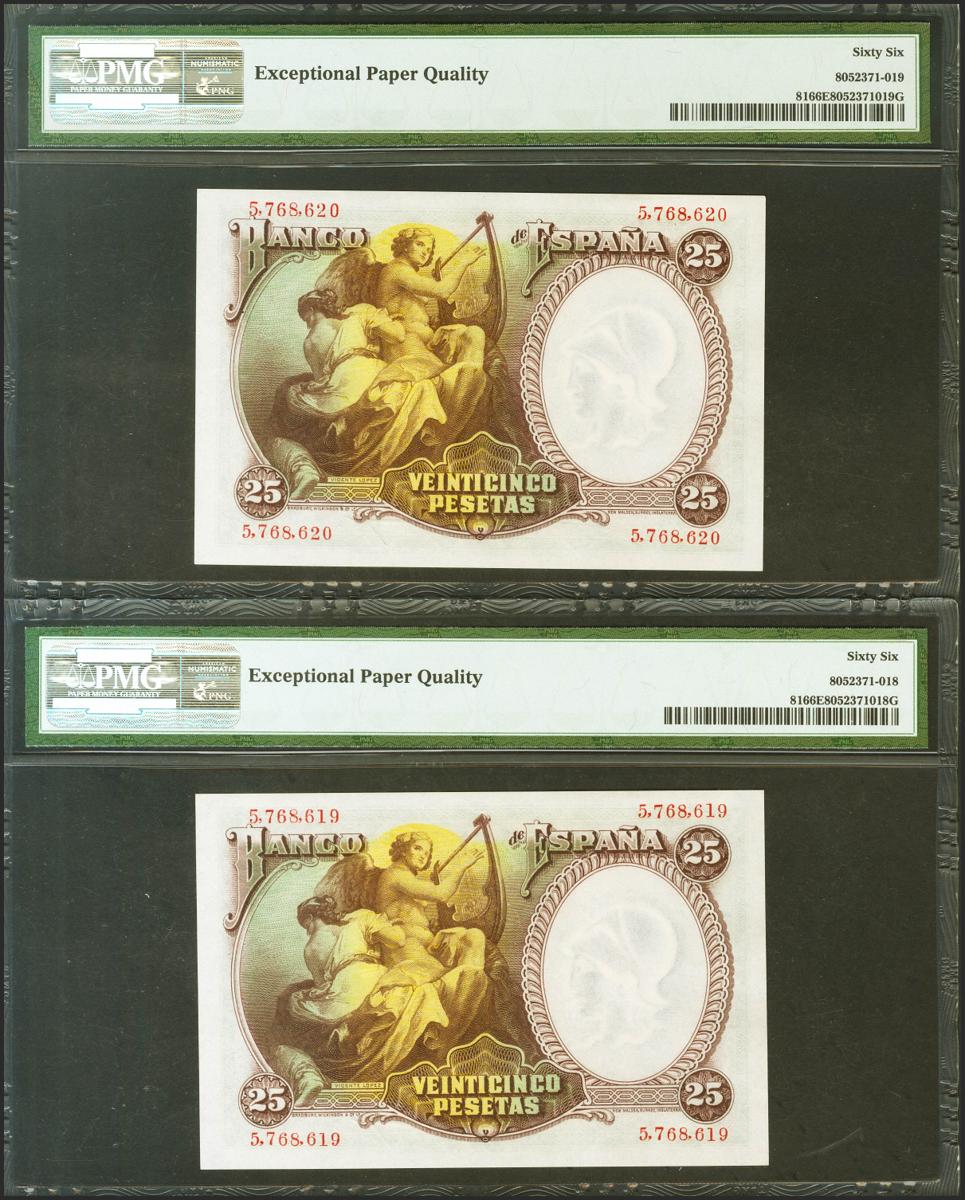25 Pesetas. 25 de Abril de 1931. Pareja correlativa. Sin serie. (Edifil 2021: 358, Pick: 81). Apresto original. Encapsulados PMG66EPQ, ambos.