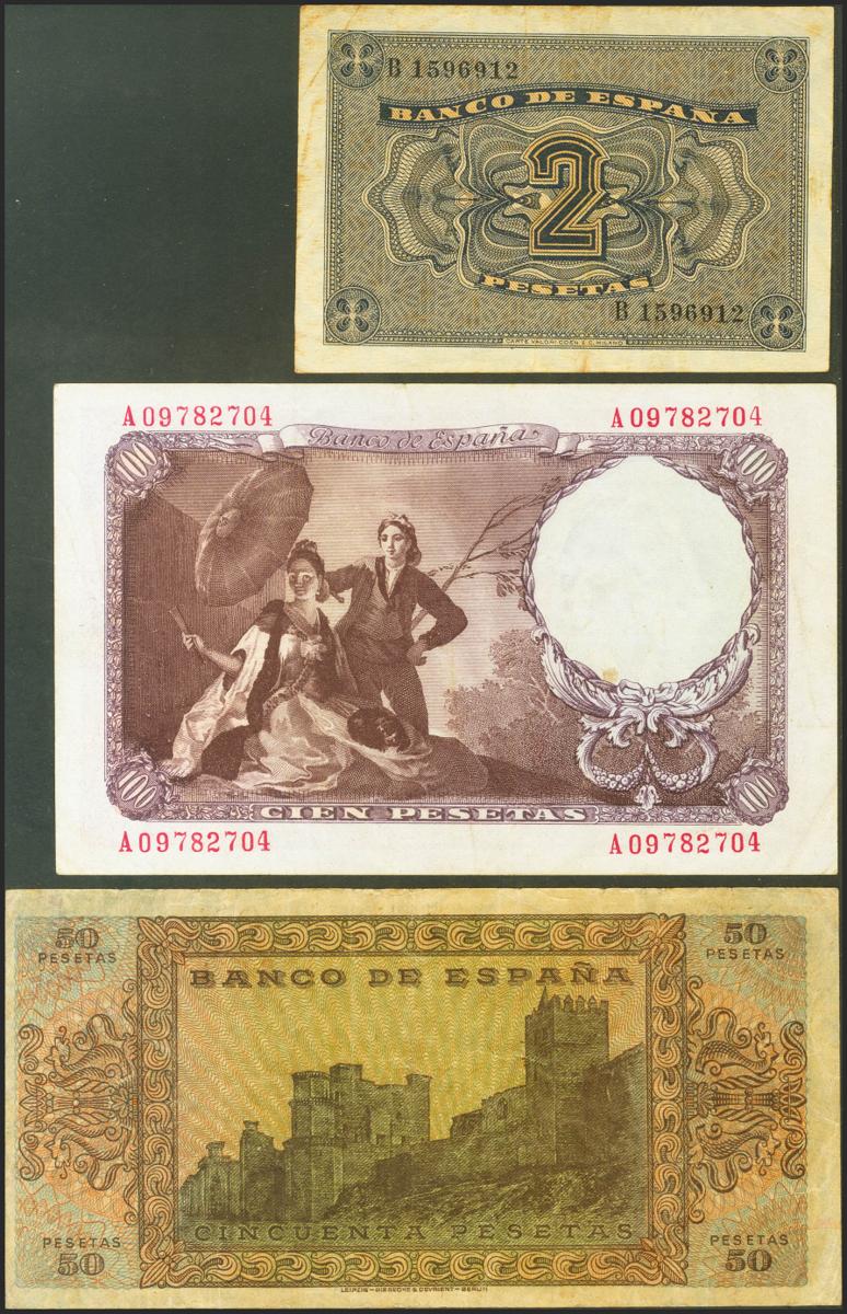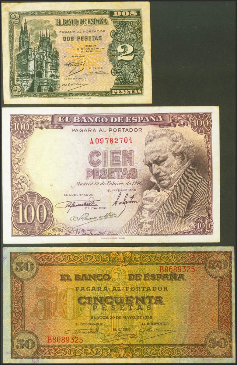 Conjunto de billetes que incluye el 2 Pesetas emitido el 12 de Octubre de 1937 y con la serie B (Edifil 2021: 426a) en MBC-, el 50 Pesetas emitido el 20 de Mayo de 1938 y con la serie B (Edifil 2021: 431a) en MBC y el 100 Pesetas emitido el 19 de Febrero de 1946 y con la serie A (Edifil 2021: 451a) en MBC-. A EXAMINAR.
