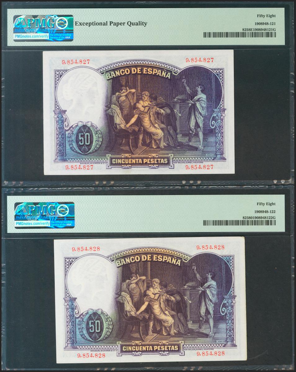 50 Pesetas. 25 de Abril de 1931. Pareja correlativa. Sin serie. (Edifil 2021: 359, Pick: 82). Inusual en esta calidad. EBC++. Encapsulado PMG58, ambos.