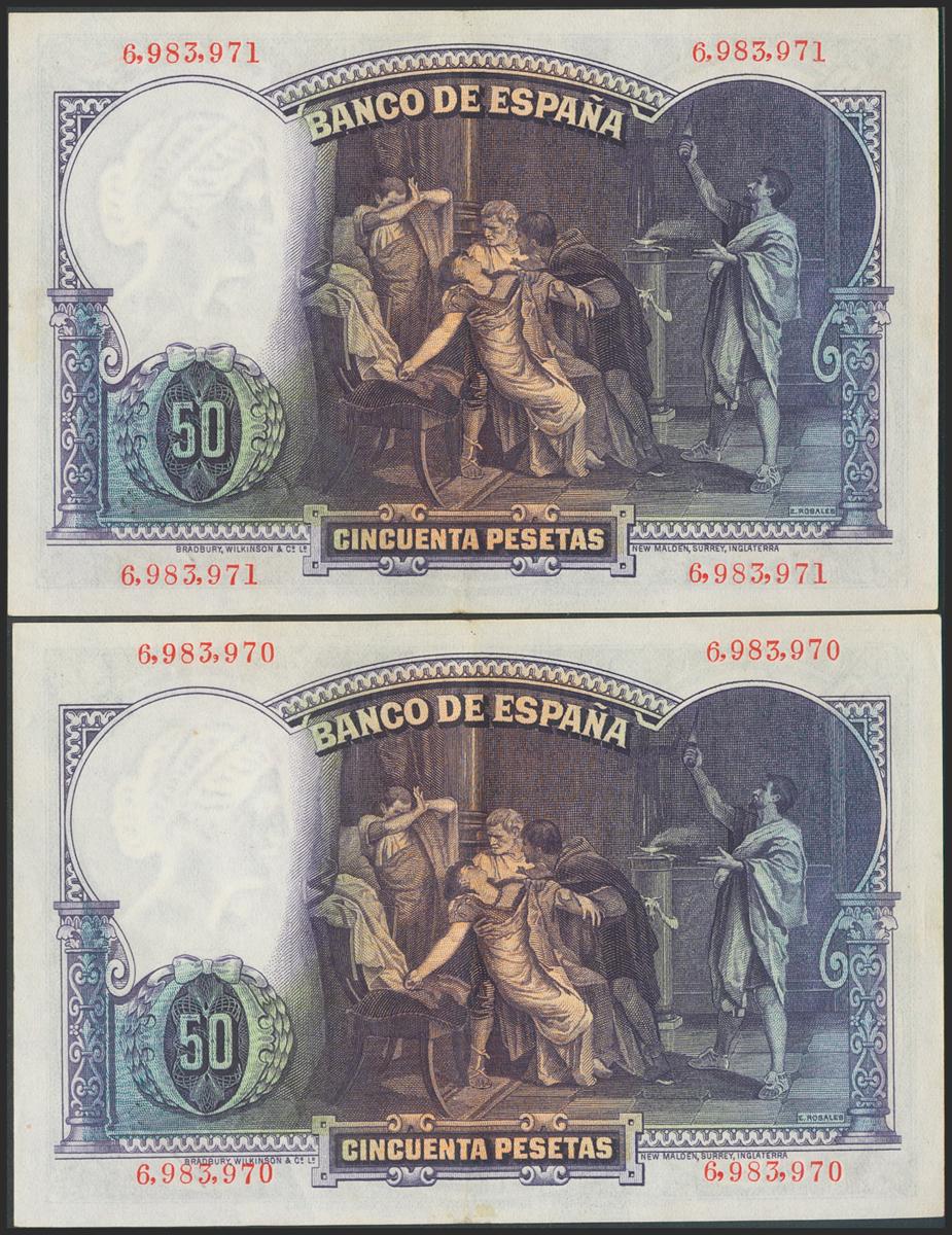 50 Pesetas. 25 de Abril de 1931. Pareja correlativa. Sin serie. (Edifil 2021: 359). Conserva parte de su apresto original, pareja enormemente atractiva. EBC+.