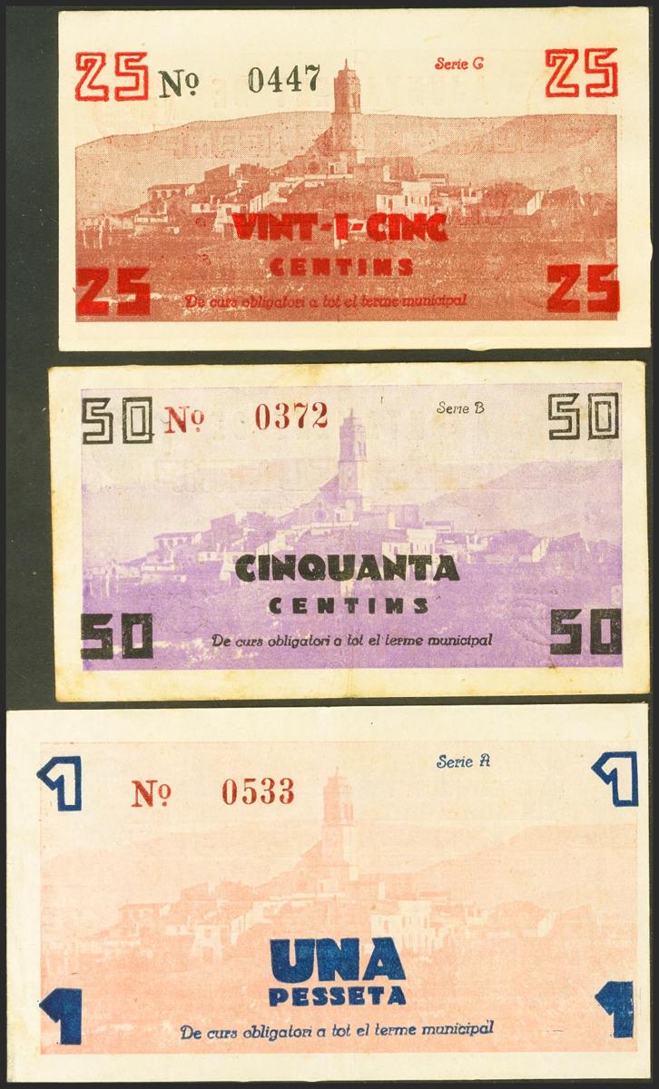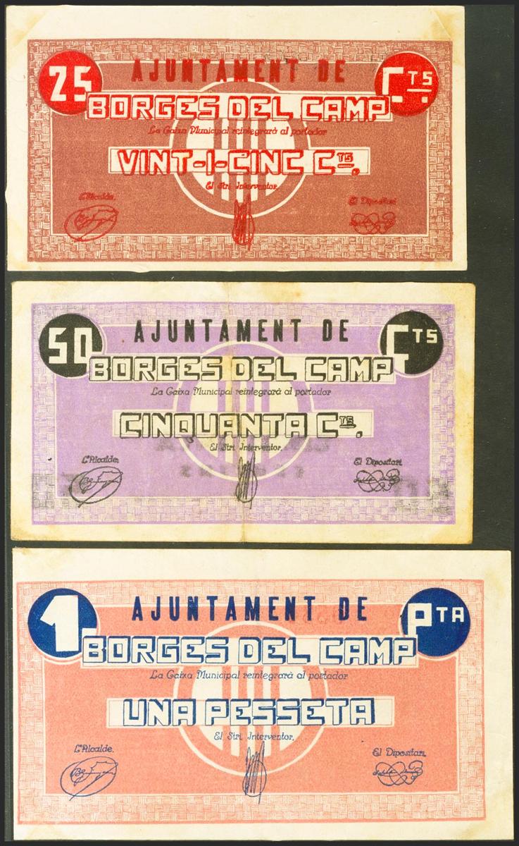 LES BORGES DEL CAMP (TARRAGONA). 25 Céntimos, 50 Céntimos y 1 Peseta. (1936ca). Serie C, B y A, respectivamente. (González: 7163/65). Rara serie completa. MBC+.