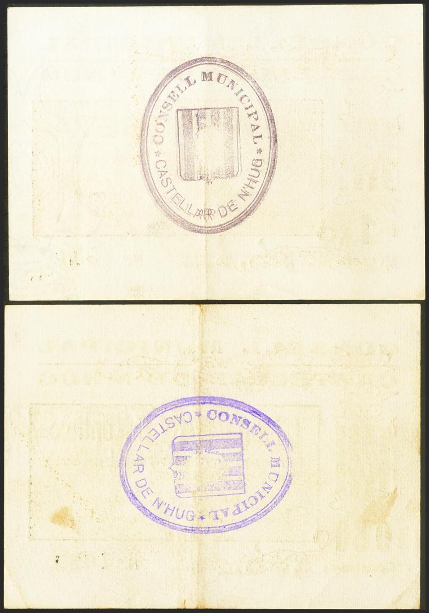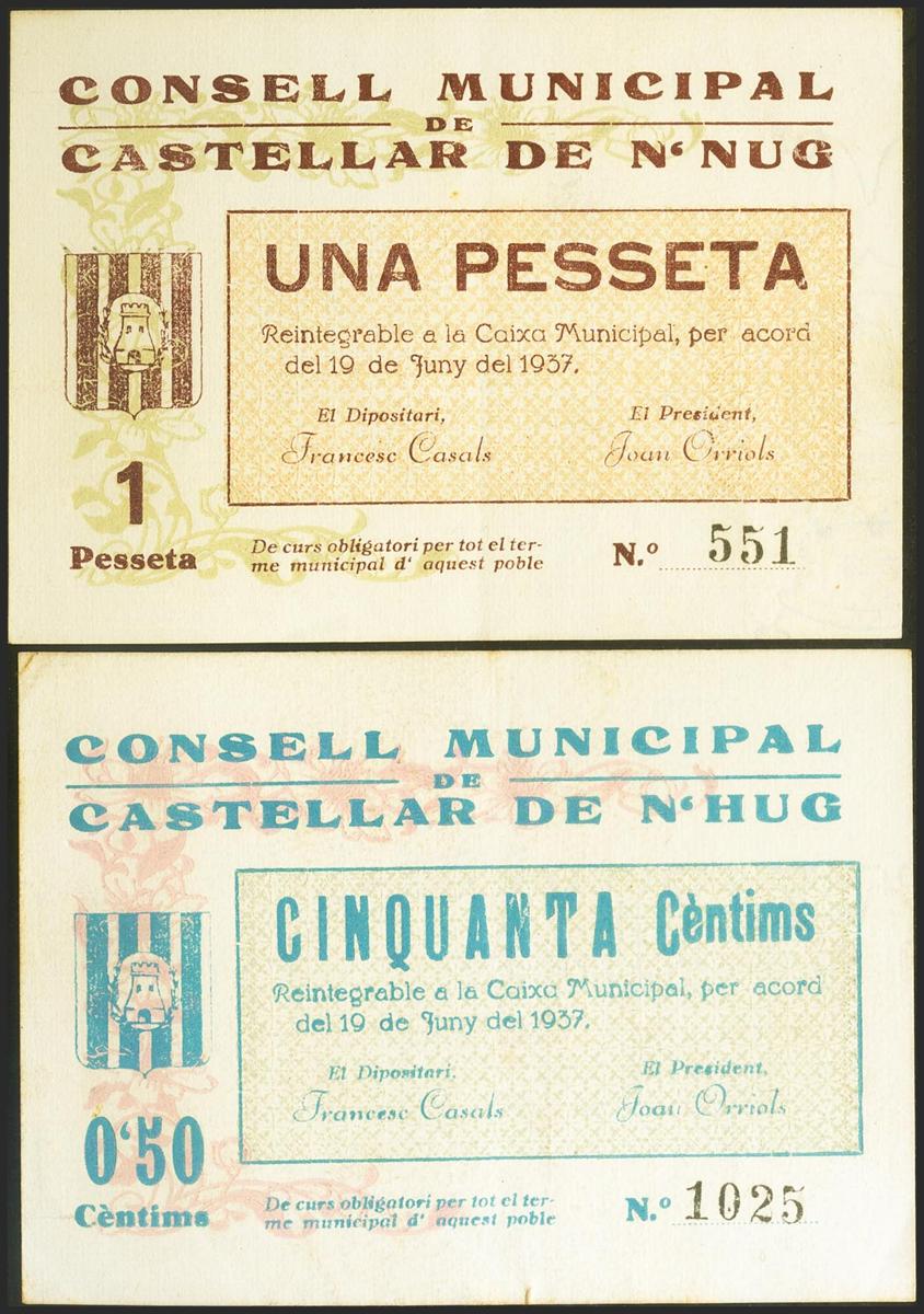 CASTELLAR DE N´HUG (BARCELONA). 50 Céntimos y 1 Peseta. 19 de Junio de 1937. (González: 7419/20). Muy rara serie completa. MBC+.