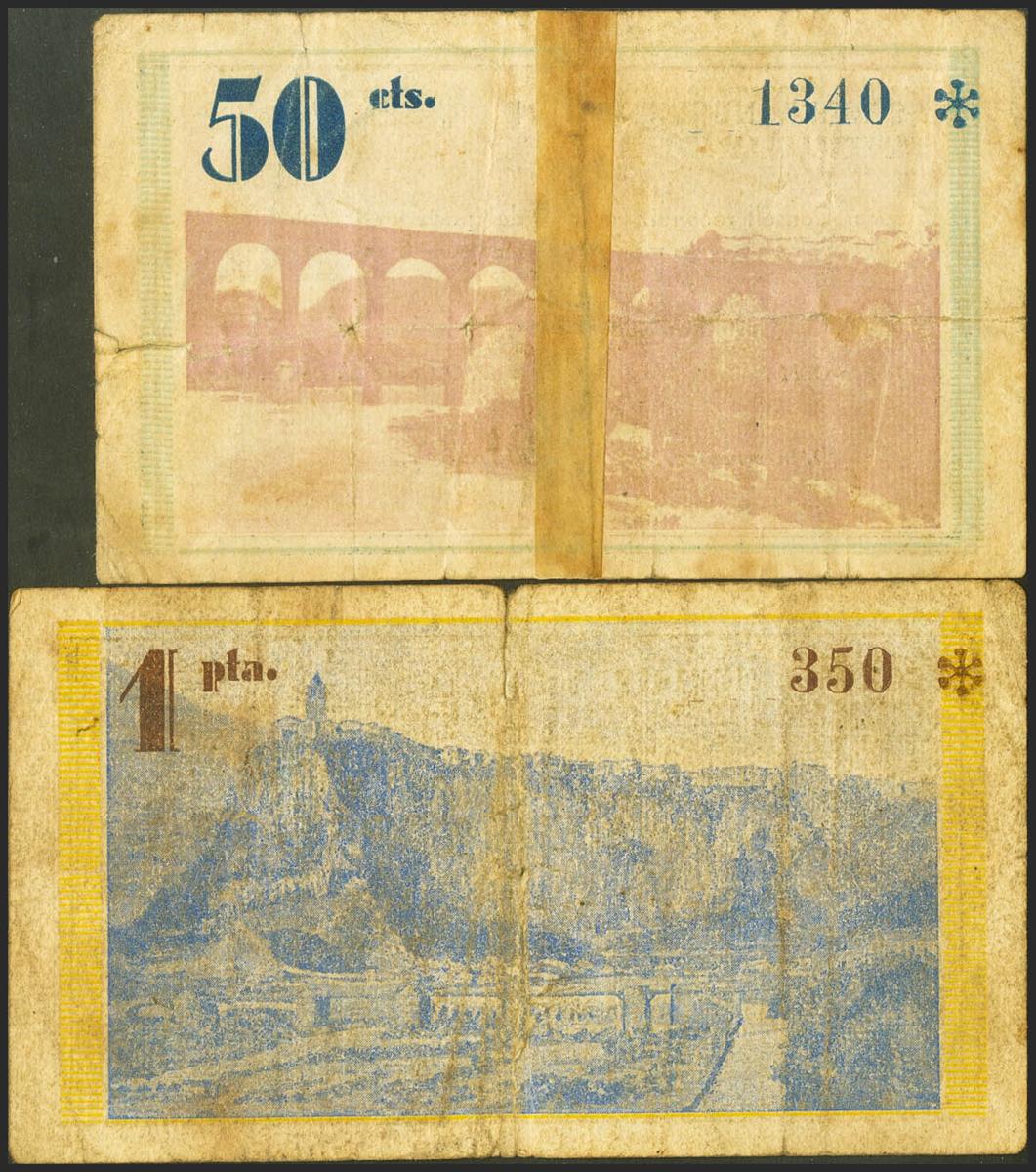 CASTELLFOLLIT DE LA ROCA (GERONA). 25 Céntimos y 1 Peseta. 12 de Junio de 1937. Serie A, ambos. (González: 7458/59). Inusual serie completa, el 50 cts presenta cinta adhesiva. MBC/MBC-.