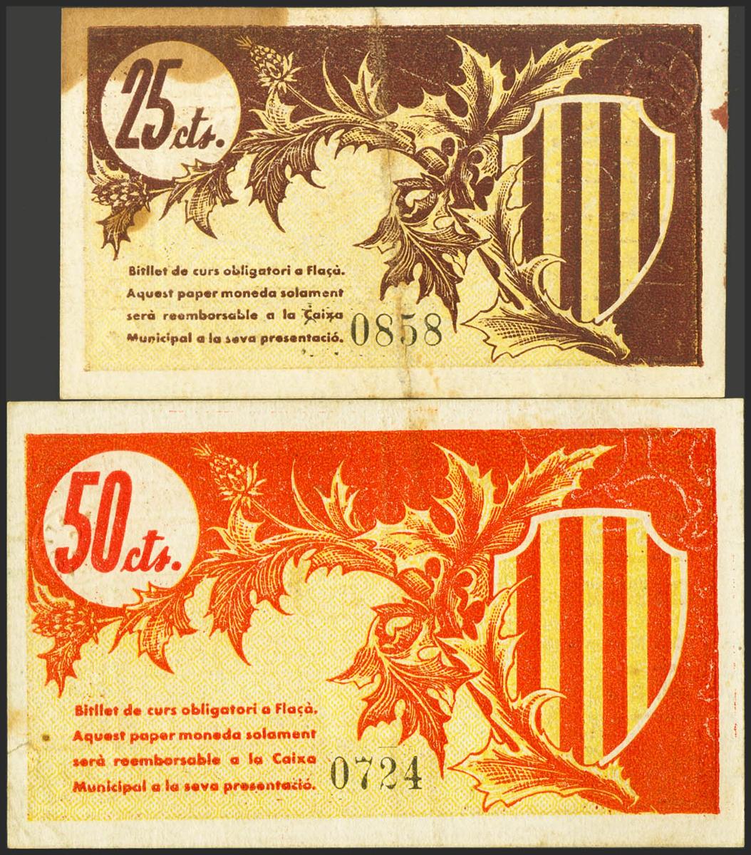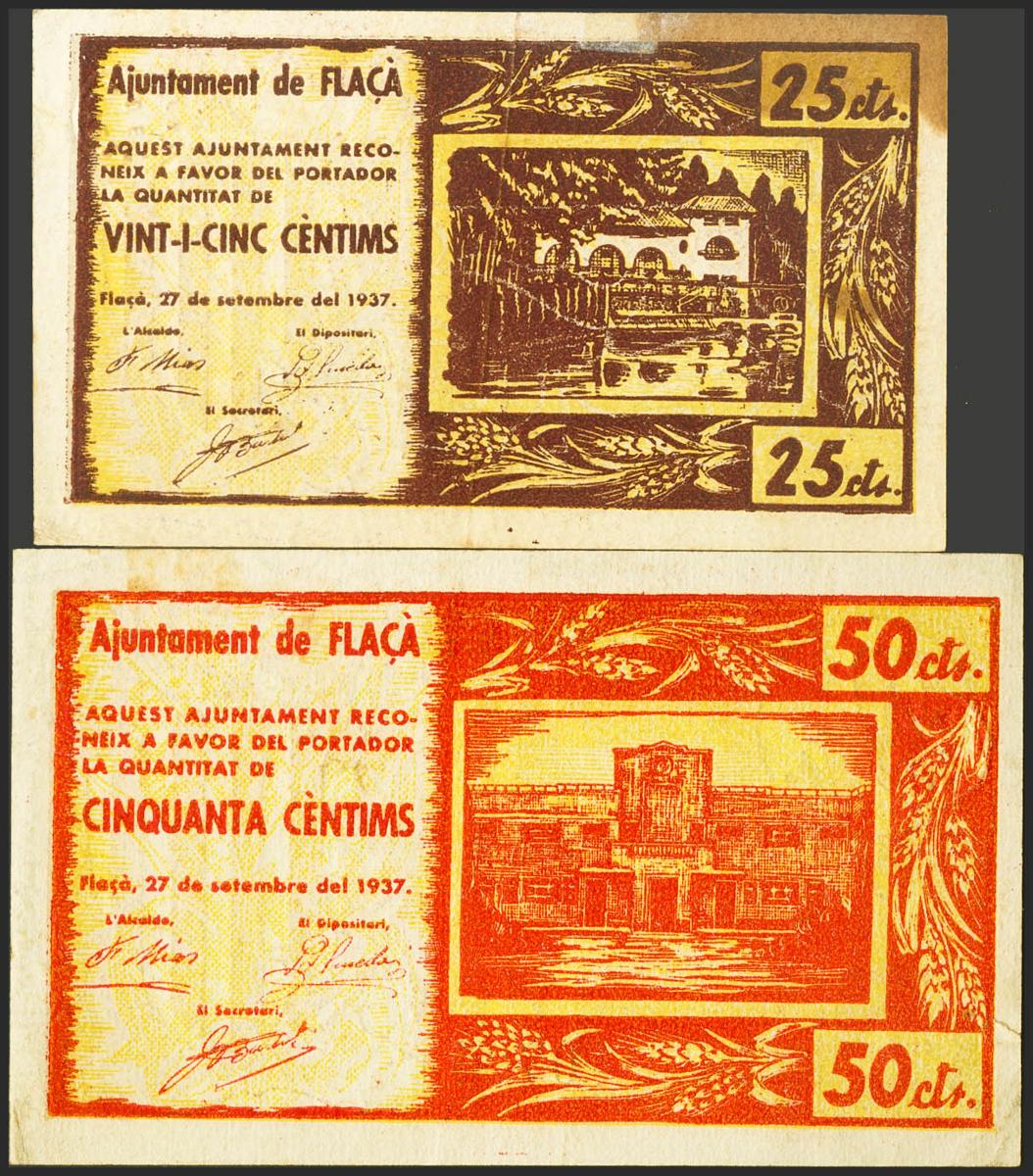 FLAÇA (GERONA). 25 Céntimos y 50 Céntimos. 27 de Septiembre de 1937. (González: 7881/82). Serie completa. MBC/BC.