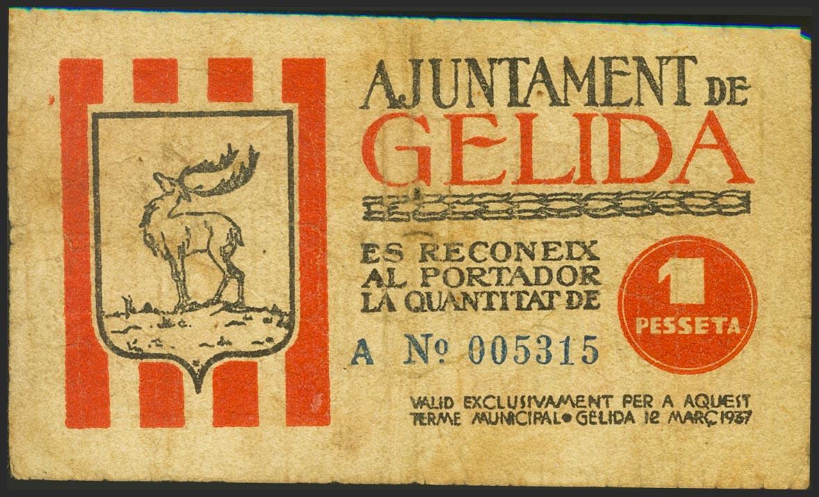 GELIDA (BARCELONA). 1 Peseta. 12 de Marzo de 1937. Serie A. (González: 8012). Inusual. MBC-.