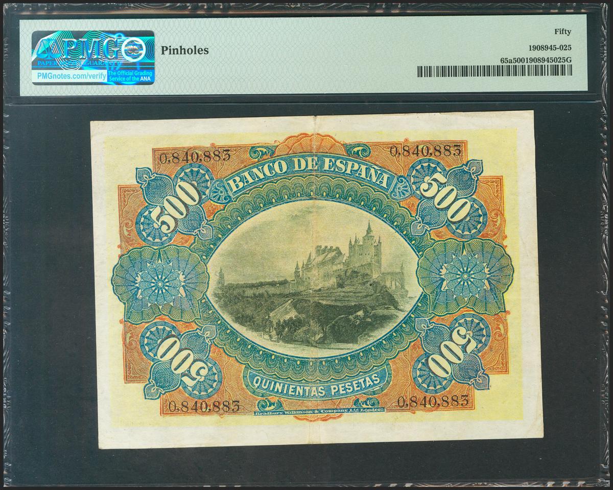 500 Pesetas. 15 de Julio de 1907. Sin serie. (Edifil 2021: 321, Pick: 65a). Raro en esta calidad, puntitos de grapa. EBC. Encapsulado PMG50.