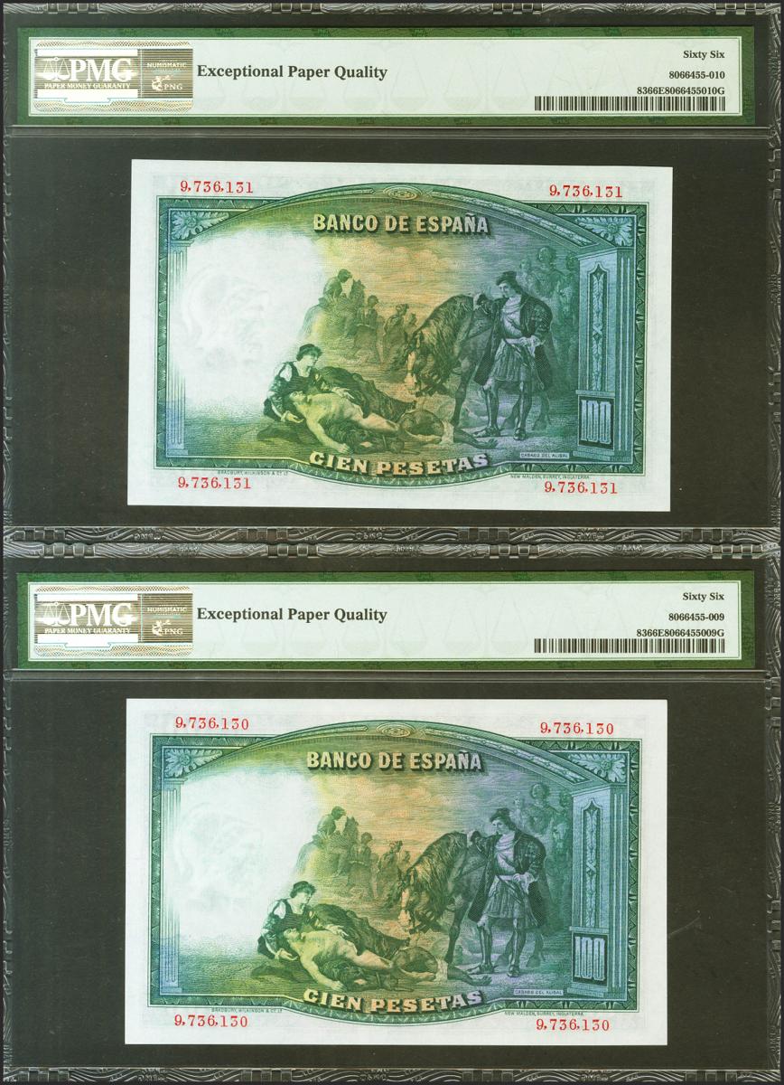 100 Pesetas. 25 de Abril de 1931. Pareja correlativa. Sin serie. (Edifil 2021: 360, Pick: 83). Apresto original. Encapsulados PMG66EPQ, ambos.