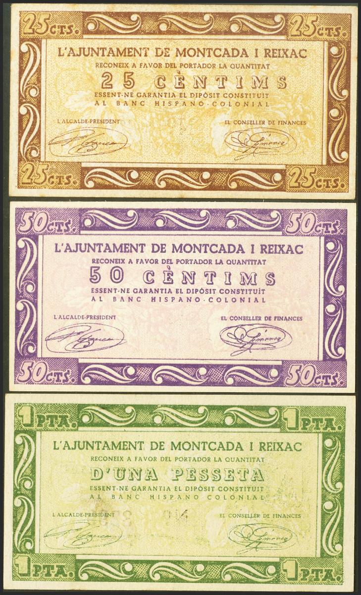 MONTACADA I REIXAC ( BARCELONA). 25 Céntimos, 50 Céntimos y 1 Peseta. 19 de Noviembre de 1937. (González: 8776/78). Inusual serie completa. EBC+.