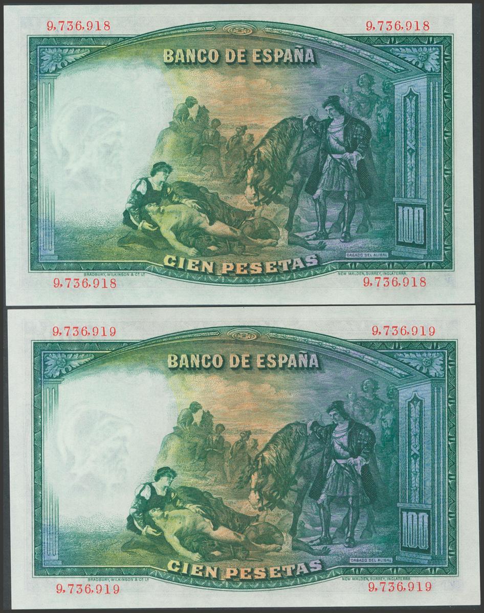 100 Pesetas. 25 de Abril de 1931. Pareja correlativa. Sin serie. (Edifil 2017: 360). Conserva todo su apresto original. SC.