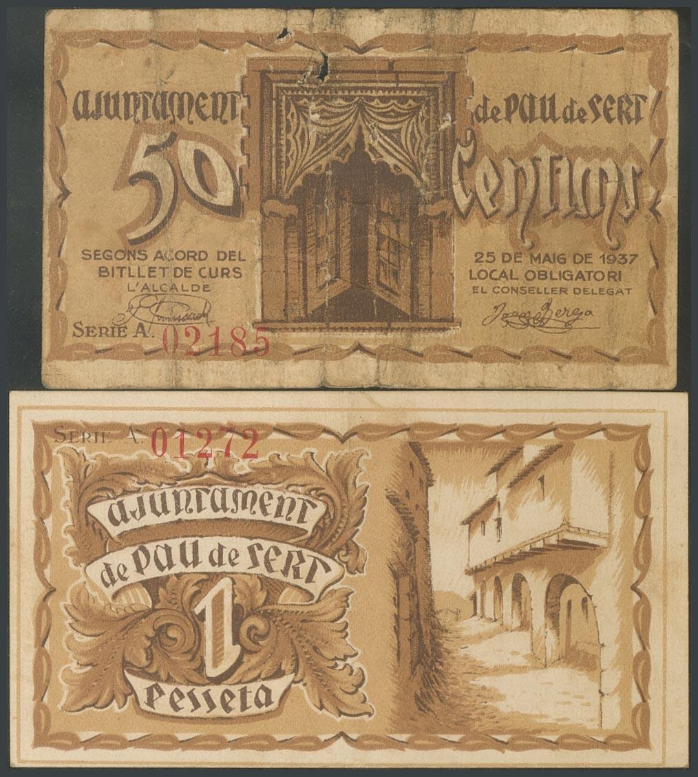 PAU DE SERT (GERONA). 50 Céntimos y 1 Peseta. 25 de Mayo de 1937. Serie A, ambos. (González: 9171/72). Inusuales. RC/EBC+.