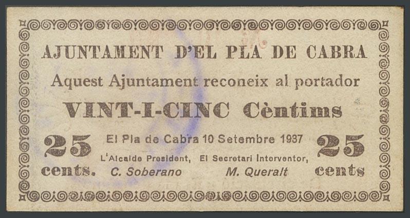 PLA DE CABRA (TARRAGONA). 25 Céntimos. 10 de Septiembre de 1937. (González: 9249). Raro. EBC.