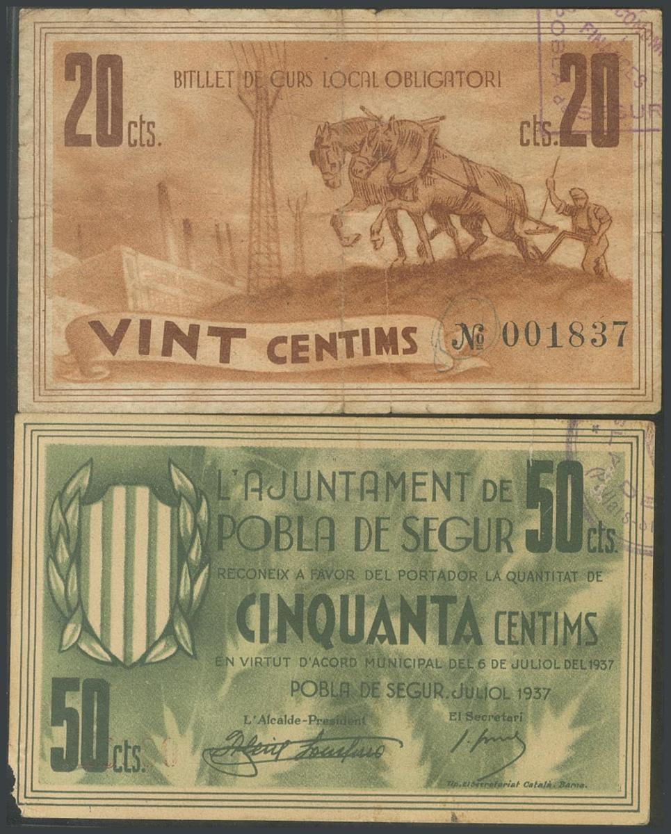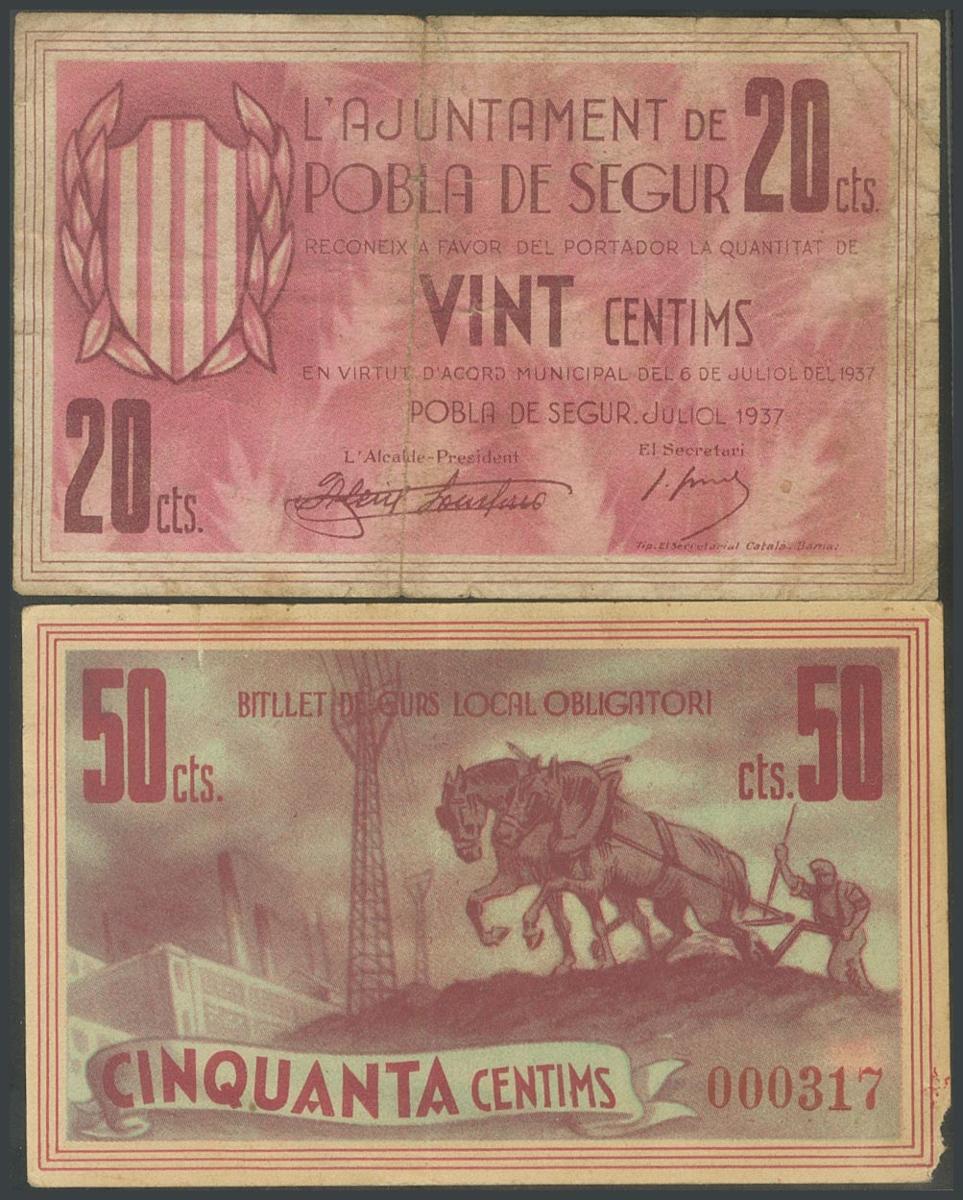 POBLA DE SEGUR (LERIDA). 20 Céntimos y 50 Céntimos. 6 de Julio de 1937. (González: 9339, 9340). BC.
