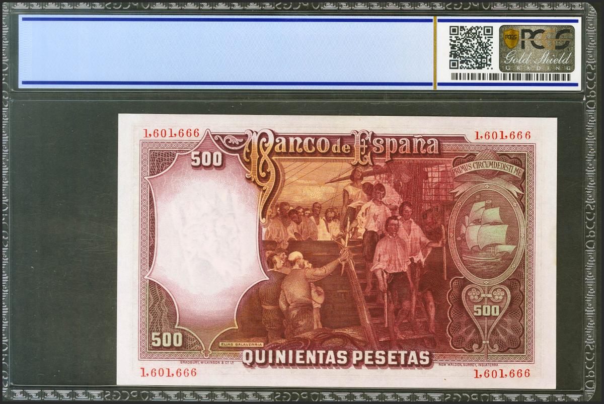 500 Pesetas. 25 de Abril de 1931. Sin serie. (Edifil 2021: 361, Pick: 84). Apresto original. SC. Encapsulado PCGS66OPQ.
