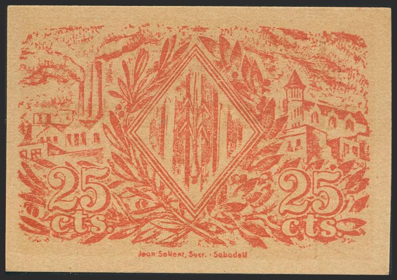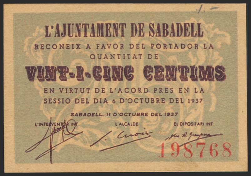 SABADELL (BARCELONA). 25 Céntimos. 11 de Octubre de 1937. (González: 9778). EBC+.