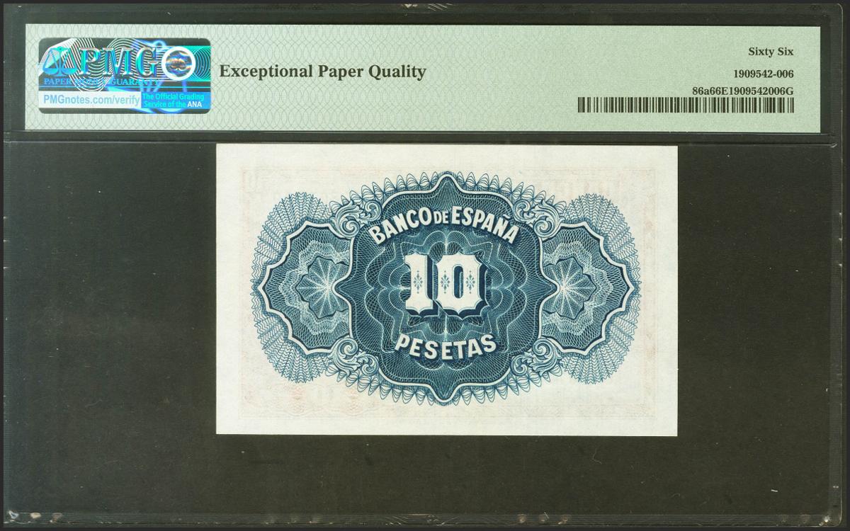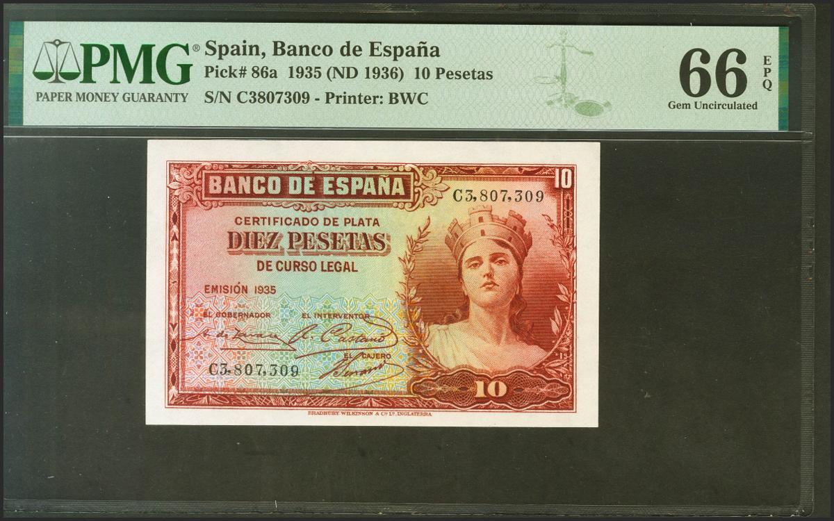 10 Pesetas. 1935. Certificado de Plata. Serie C, última serie emitida. (Edifil 2021: 364a, Pick: 86a). Apresto original. SC. Encapsulado PMG66EPQ.