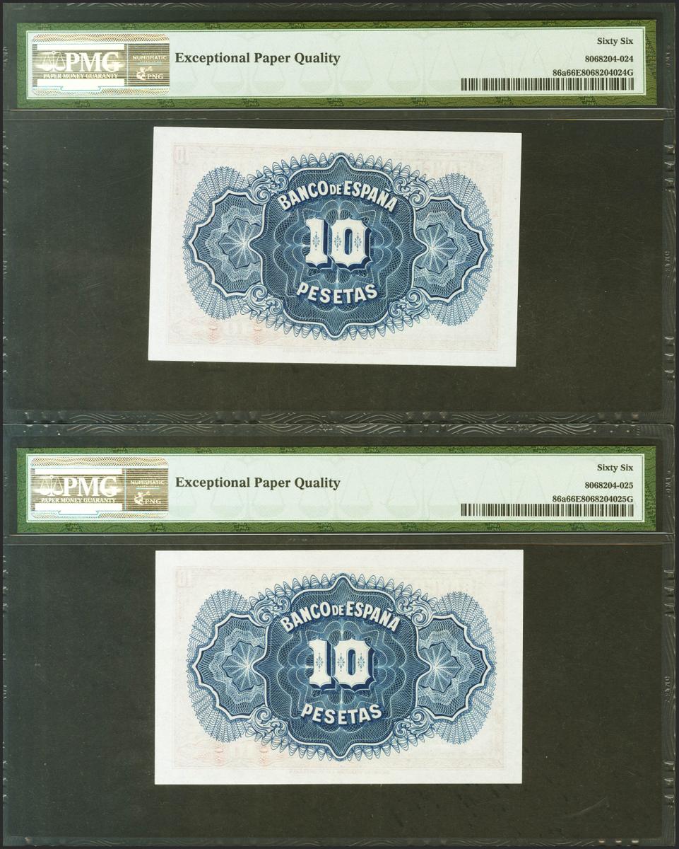10 Pesetas. 1935. Certificado de Plata. Pareja correlativa. Sin serie. (Edifil 2021: 364, Pick: 86a). Rarísimo en esta calidad y apresto original. SC. Encapsulados PMG66EPQ, ambos.