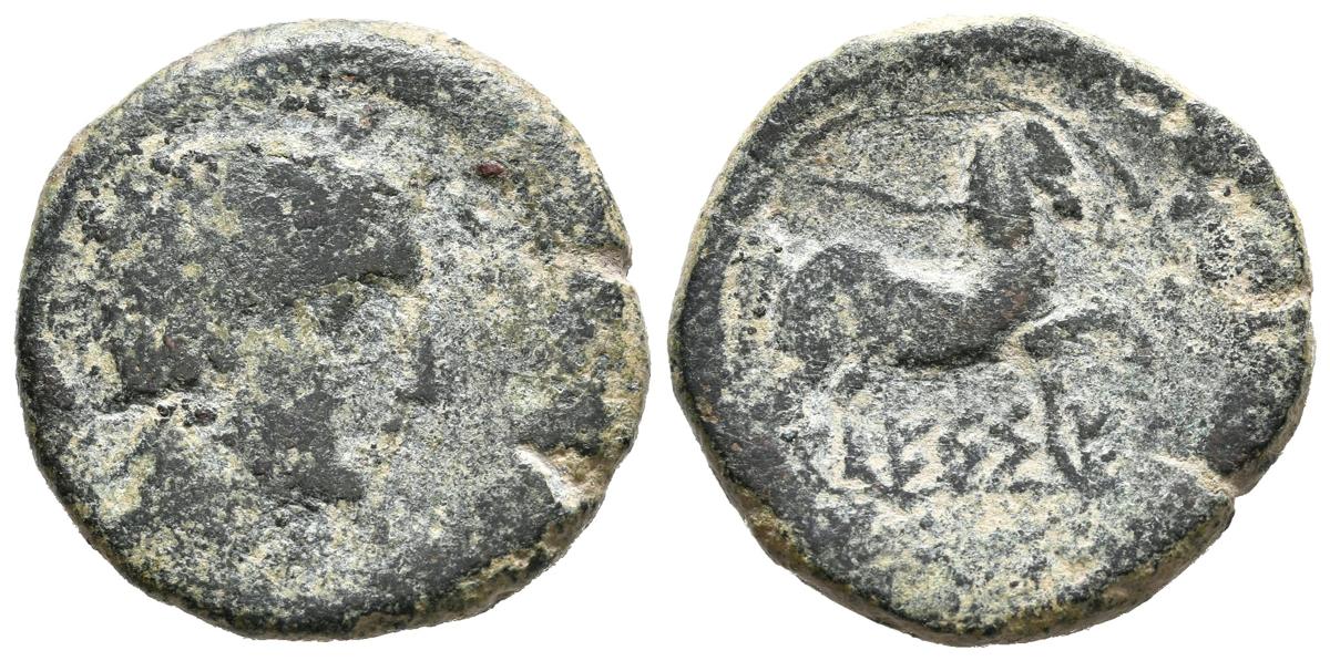 CESE (Tarragona). Semis. (Ae. 6,27g/22mm). 110-20 a.C. (¿FAB-2353?). Anv: Cabeza masculina a derecha, detrás letra ibérica ¿Be?. Rev: Caballo a derecha, debajo leyenda ibérica: CESSE. MBC-.