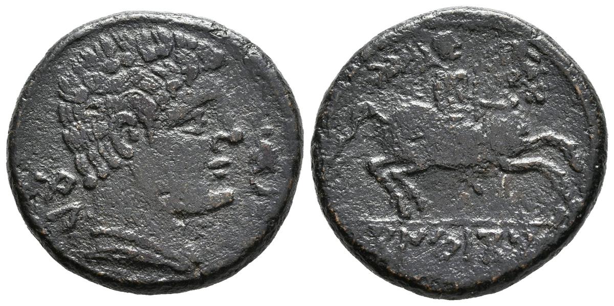 CONTEBACOM BEL (Botorrita, Zaragoza). As. (Ae. 8,87g/24mm). 120-80 a.C. (FAB-863). Anv: Cabeza masculina a derecha, detrás letras ibéricas: BeL, delante delfín. Rev: Jinete con palma a derecha, debajo leyenda: CoNTeBaCoM. MBC-.
