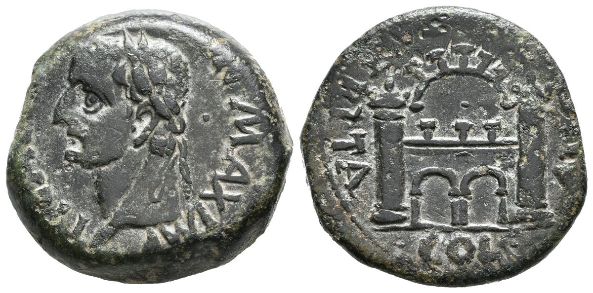 EMERITA AUGUSTA (Mérida). As. (Ae. 12,13g/23mm). 14-36 d.C. (FAB-1056). Anv: Cabeza laureada de Tiberio a izquierda, alrededor leyenda: TI CAESAR AVGVSTVS PON MAX IMP. Rev: Puerta, alrededor leyenda: COL AVGVSTA EMERITA. MBC+.